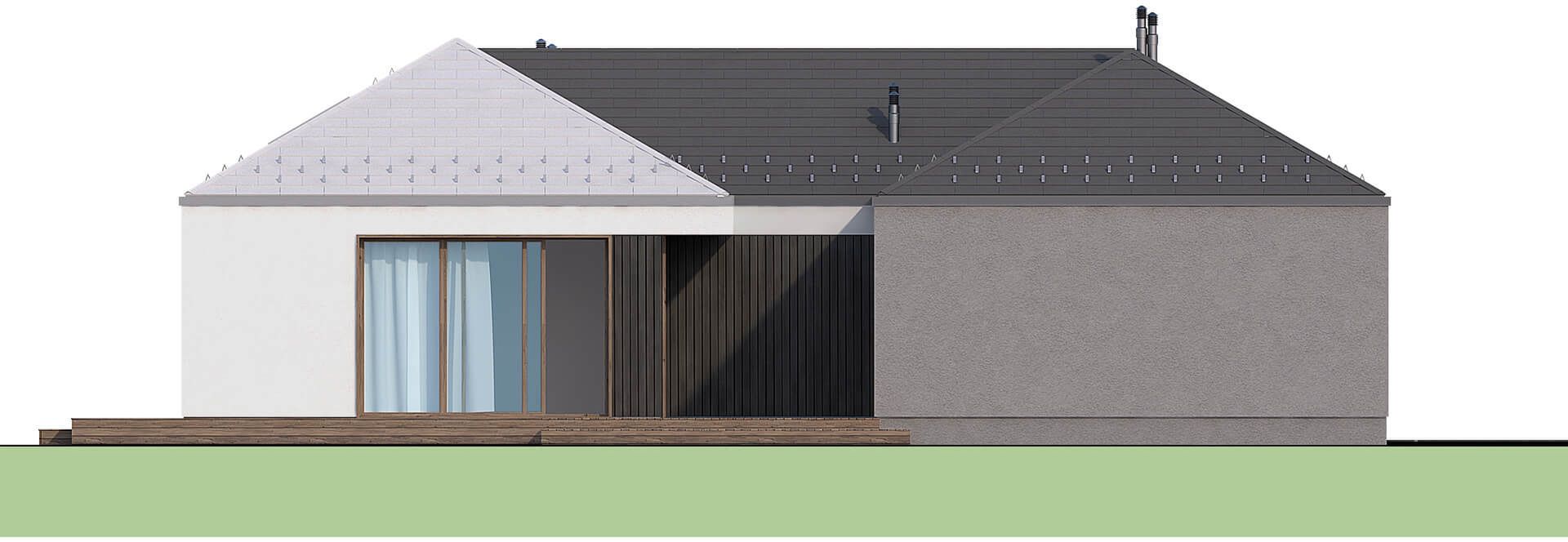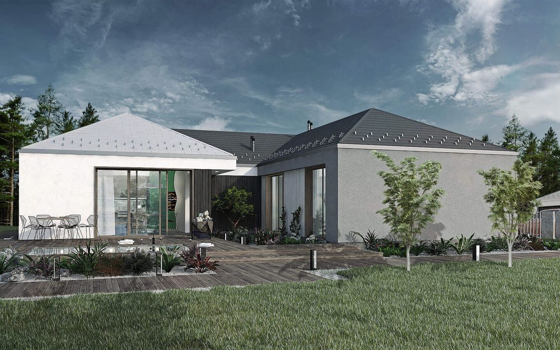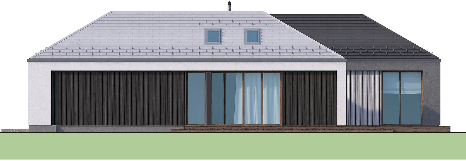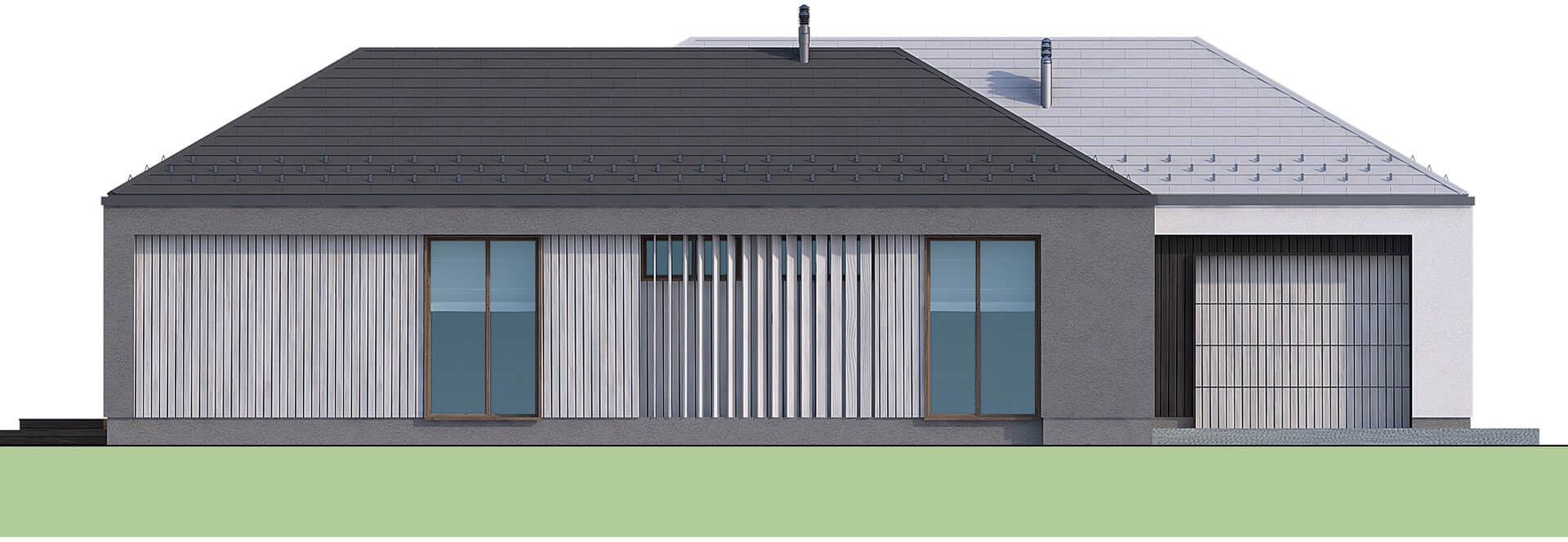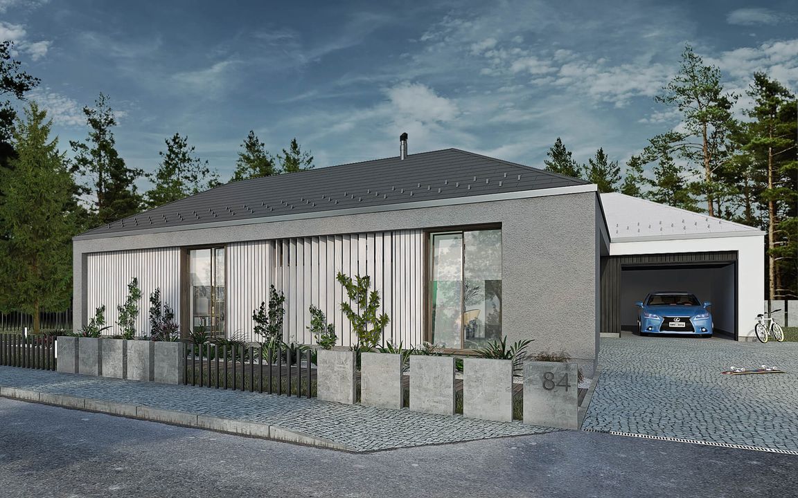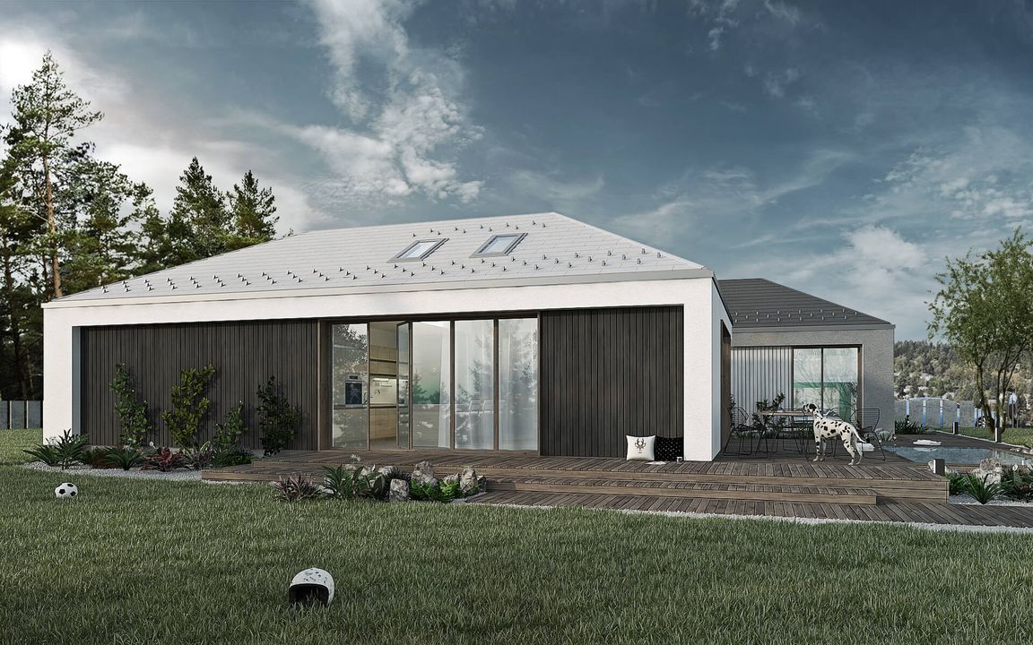Graficzne opracowanie rzutów poglądowych widocznych na karcie projektu zostało wykonane przez Extradom.pl. Prezentowane przez Extradom.pl wizualizacje wykonane zostały przez autora projektu i należy poczytywać je jedynie za przykład i propozycję wykończenia, wizję architektoniczną autora projektu. Ostateczne wykończenie budynku może nastąpić na wiele sposobów. Szczegółowe rozwiązania zastosowane w oferowanej dokumentacji - w tym również ilość, lokalizacje i wygląd okien, drzwi, kominów - mogą w niewielkim stopniu różnić się od prezentowanej wizualizacji budynku.