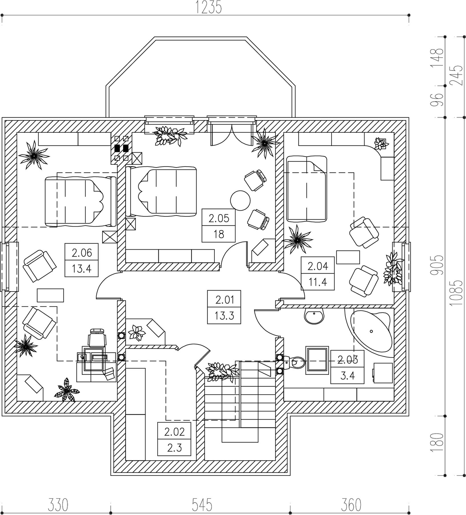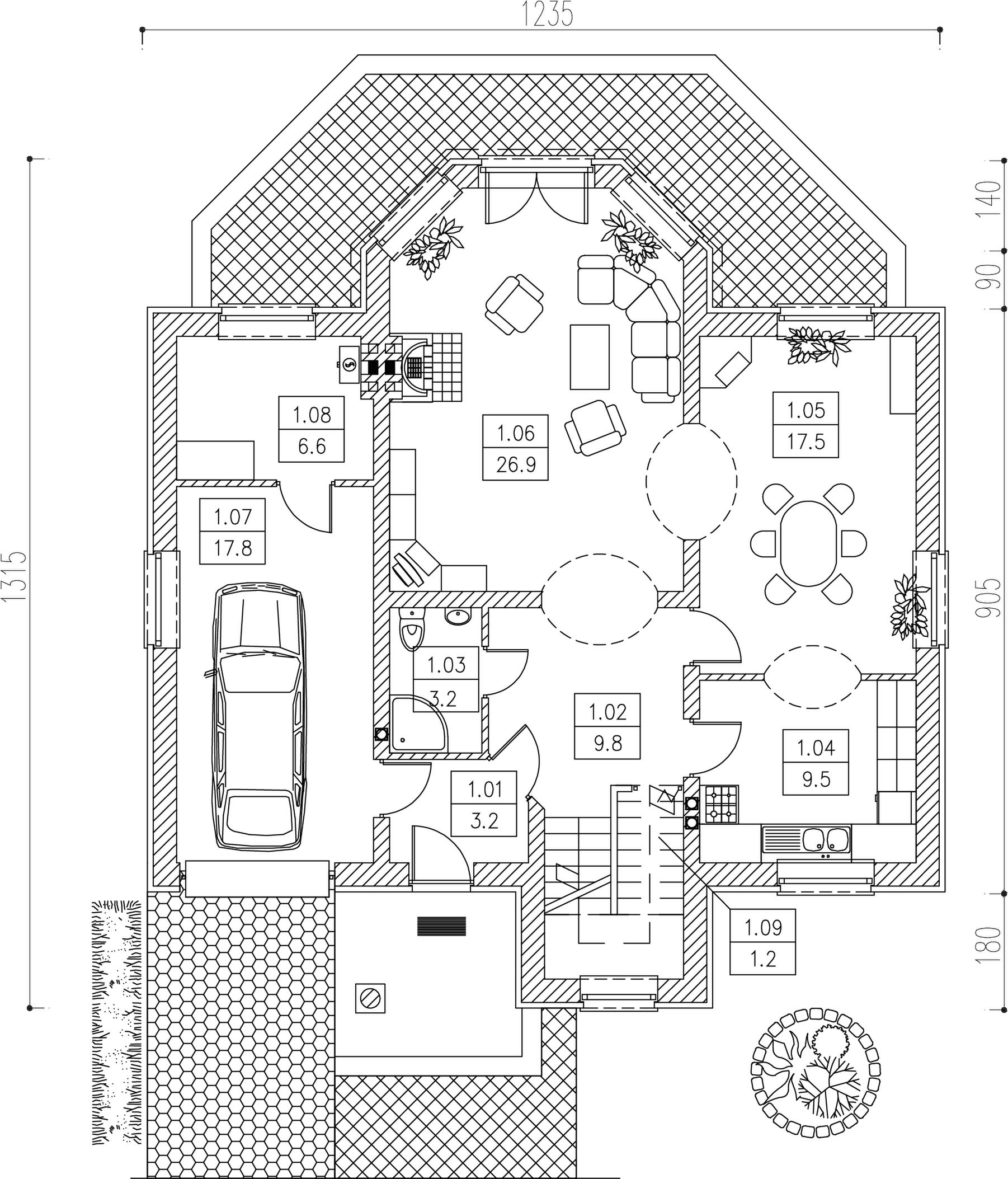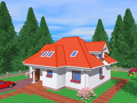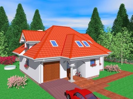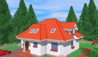 Graficzne opracowanie rzutów poglądowych widocznych na karcie projektu zostało wykonane przez Extradom.pl. Prezentowane przez Extradom.pl wizualizacje wykonane zostały przez autora projektu i należy poczytywać je jedynie za przykład i propozycję wykończenia, wizję architektoniczną autora projektu. Ostateczne wykończenie budynku może nastąpić na wiele sposobów. Szczegółowe rozwiązania zastosowane w oferowanej dokumentacji - w tym również ilość, lokalizacje i wygląd okien, drzwi, kominów - mogą w niewielkim stopniu różnić się od prezentowanej wizualizacji budynku.