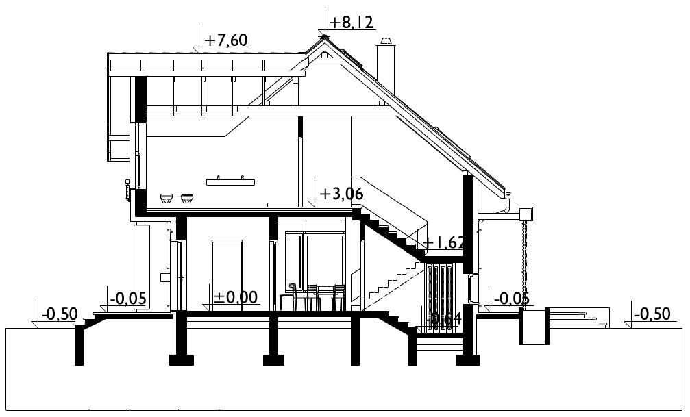 Wersja technologiczna: murowana - beton komórkowy. Strop: żelbetowy monolityczny. Typ schodów: płytowe żelbetowe. Konstrukcja dachu: drewniana krokwiowo-jętkowa. Typ ogrzewania: Kocioł na gaz. Dostępna wersja z pompą ciepła: Tak. Ściany zewnętrzne: 30 cm beton komórkowy. Ściany wewnętrzne: 24 cm beton komórkowy. Ściany wewnętrzne działowe: 11 cm beton komórkowy.