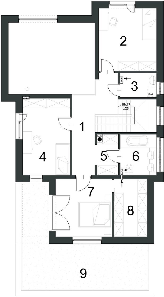 Graficzne opracowanie rzutów poglądowych widocznych na karcie projektu zostało wykonane przez Extradom.pl. Prezentowane przez Extradom.pl wizualizacje wykonane zostały przez autora projektu i należy poczytywać je jedynie za przykład i propozycję wykończenia, wizję architektoniczną autora projektu. Ostateczne wykończenie budynku może nastąpić na wiele sposobów. Szczegółowe rozwiązania zastosowane w oferowanej dokumentacji - w tym również ilość, lokalizacje i wygląd okien, drzwi, kominów - mogą w niewielkim stopniu różnić się od prezentowanej wizualizacji budynku.