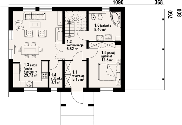 Wysokość ścianki kolankowej: 1.05 m. Strop: płyta żelbetowa. Pokrycie dachu: dachówka ceramiczna. Ściany zewnętrzne: pustaki ceramiczne + styropian. Ściany wewnętrzne: pustaki ceramiczne. Typ ogrzewania: kocioł gazowy. Instalacje dodatkowe: instalacja solarna.