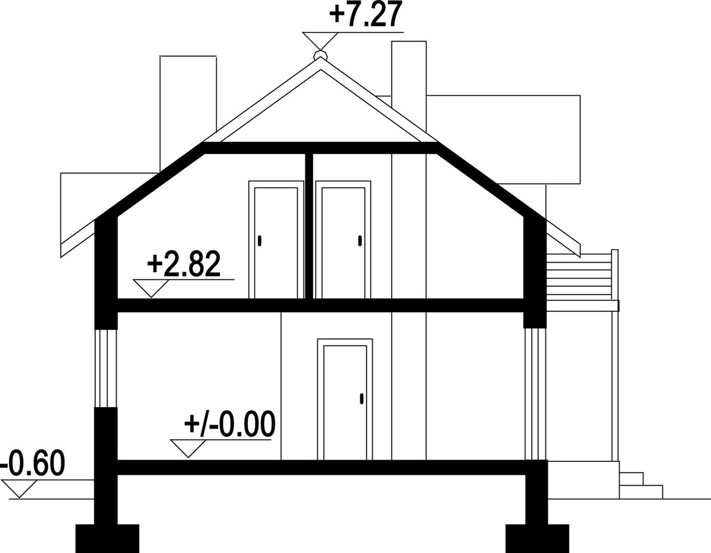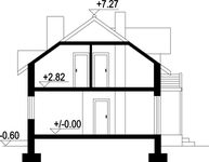 Wys. ścianki kolankowej 1.44 m Ilość drewna na więźbę 7.59 m³. Strop: płyta żelbetowa. Pokrycie dachu: dachówka ceramiczna. Ściany wewnętrzne: pustaki ceramiczne. Ściany zewnętrzne: pustaki ceramiczne + styropian. Typ ogrzewania: kocioł gazowy Inst. dodatkowe instalacja solarna.
