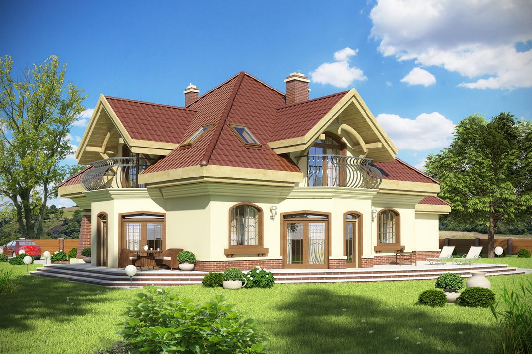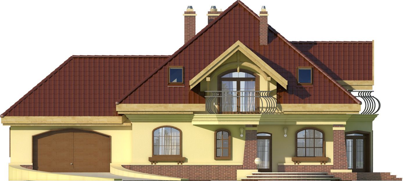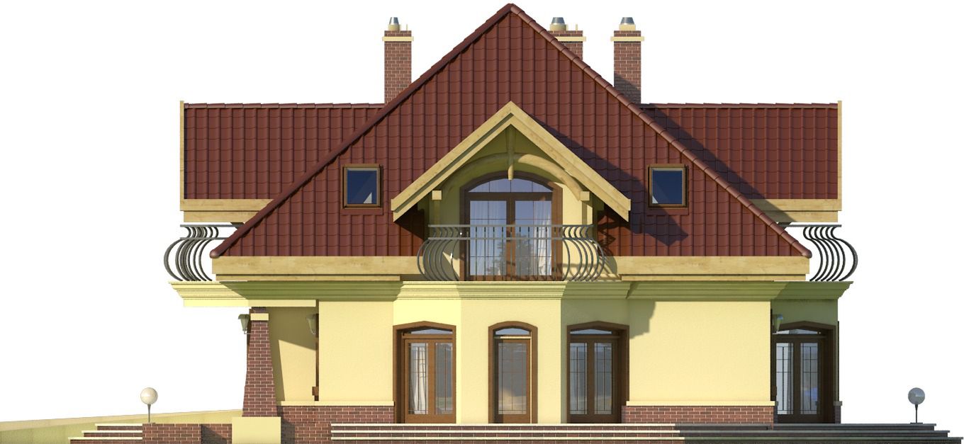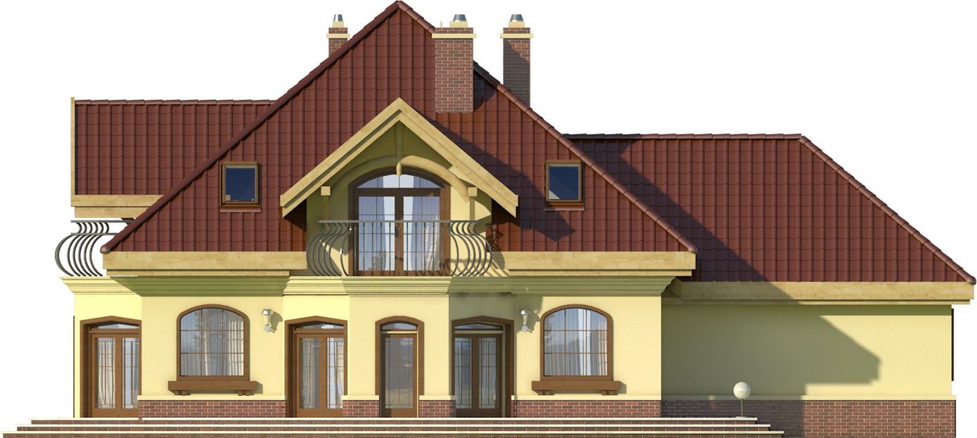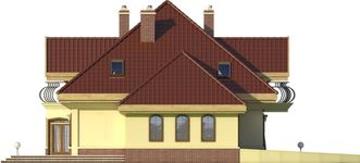 Graficzne opracowanie rzutów poglądowych widocznych na karcie projektu zostało wykonane przez Extradom.pl. Prezentowane przez Extradom.pl wizualizacje wykonane zostały przez autora projektu i należy poczytywać je jedynie za przykład i propozycję wykończenia, wizję architektoniczną autora projektu. Ostateczne wykończenie budynku może nastąpić na wiele sposobów. Szczegółowe rozwiązania zastosowane w oferowanej dokumentacji - w tym również ilość, lokalizacje i wygląd okien, drzwi, kominów - mogą w niewielkim stopniu różnić się od prezentowanej wizualizacji budynku.