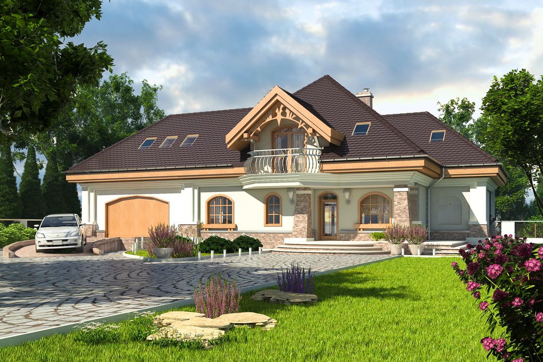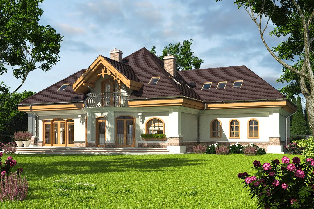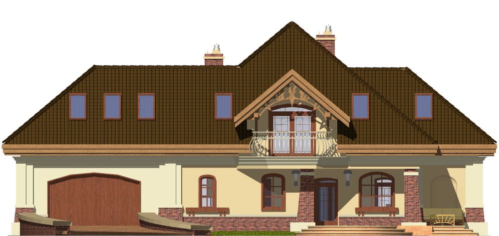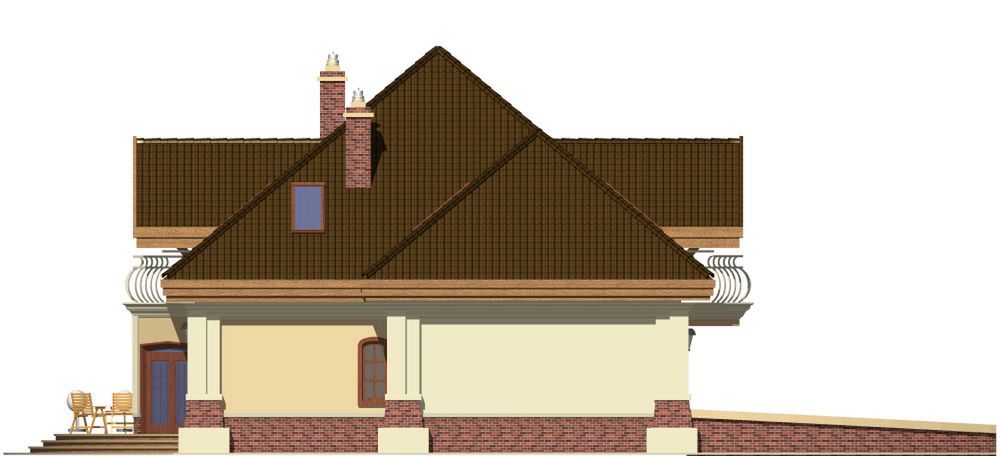 Graficzne opracowanie rzutów poglądowych widocznych na karcie projektu zostało wykonane przez Extradom.pl. Prezentowane przez Extradom.pl wizualizacje wykonane zostały przez autora projektu i należy poczytywać je jedynie za przykład i propozycję wykończenia, wizję architektoniczną autora projektu. Ostateczne wykończenie budynku może nastąpić na wiele sposobów. Szczegółowe rozwiązania zastosowane w oferowanej dokumentacji - w tym również ilość, lokalizacje i wygląd okien, drzwi, kominów - mogą w niewielkim stopniu różnić się od prezentowanej wizualizacji budynku.
