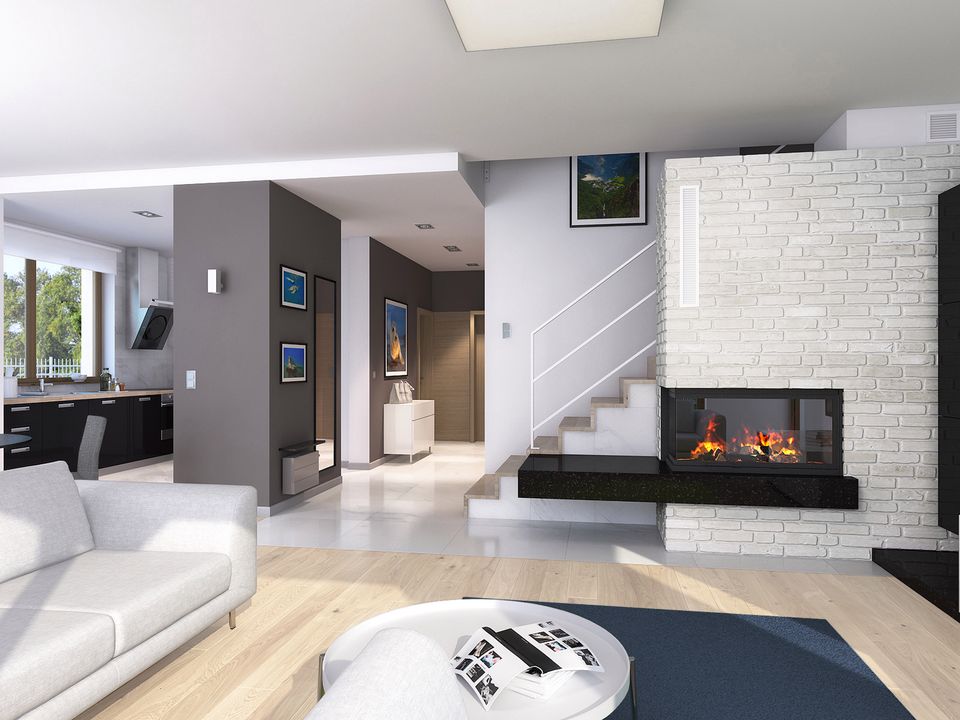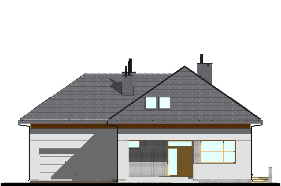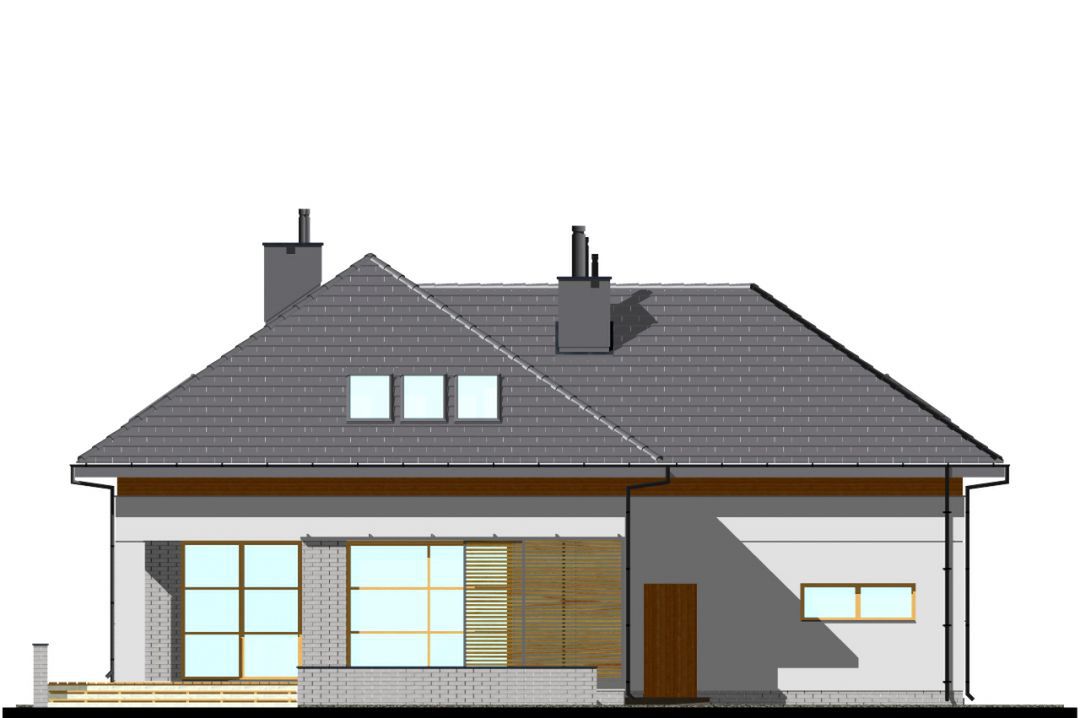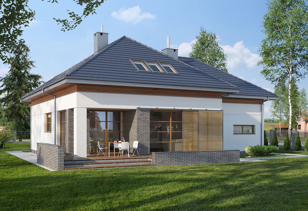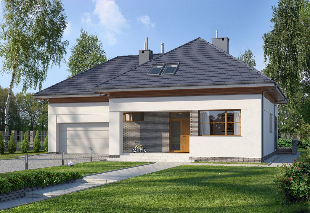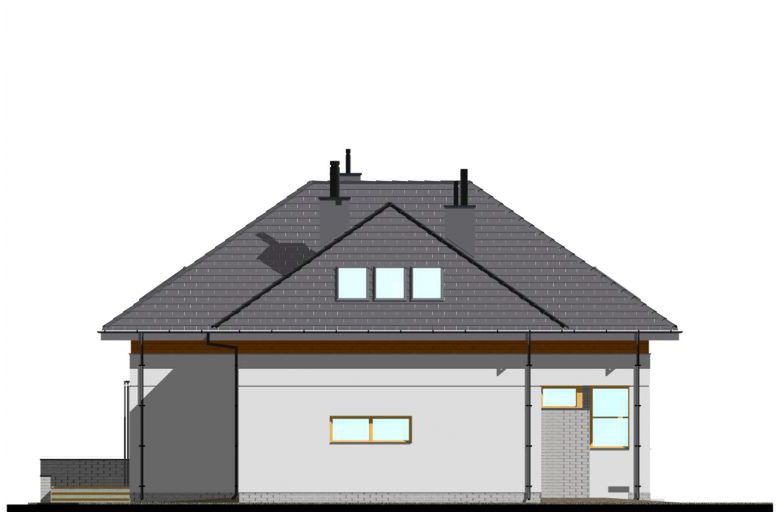 Graficzne opracowanie rzutów poglądowych widocznych na karcie projektu zostało wykonane przez Extradom.pl. Prezentowane przez Extradom.pl wizualizacje wykonane zostały przez autora projektu i należy poczytywać je jedynie za przykład i propozycję wykończenia, wizję architektoniczną autora projektu. Ostateczne wykończenie budynku może nastąpić na wiele sposobów. Szczegółowe rozwiązania zastosowane w oferowanej dokumentacji - w tym również ilość, lokalizacje i wygląd okien, drzwi, kominów - mogą w niewielkim stopniu różnić się od prezentowanej wizualizacji budynku.