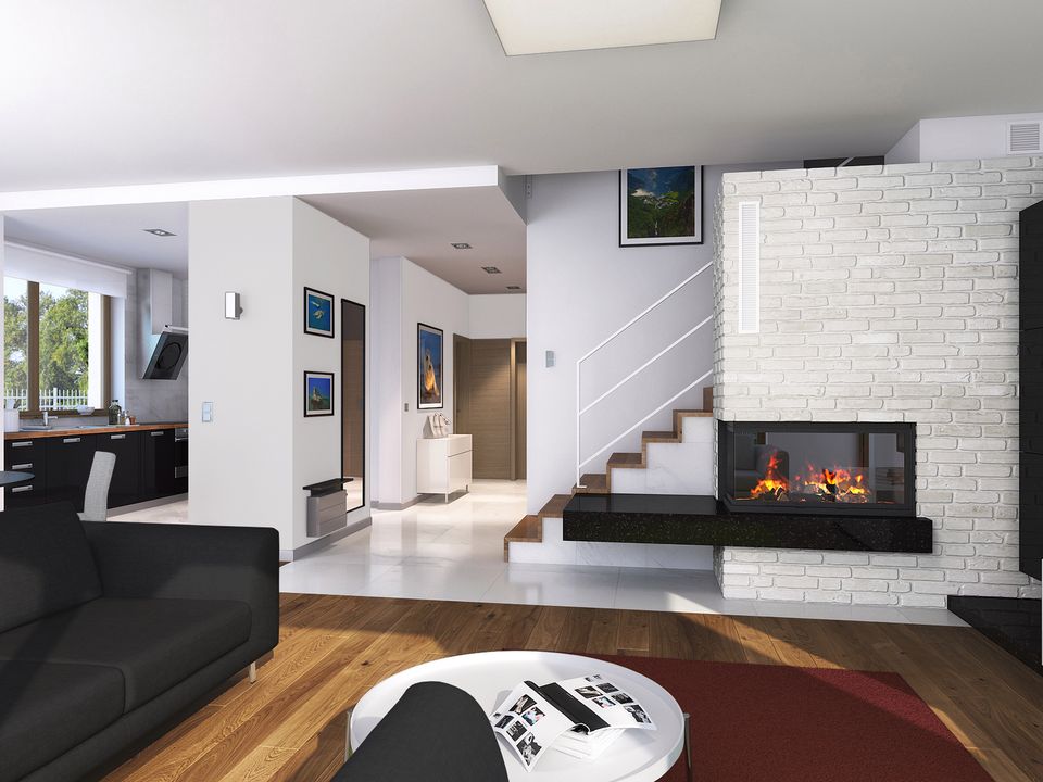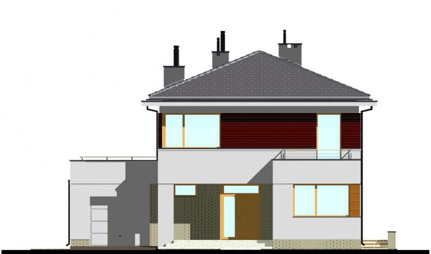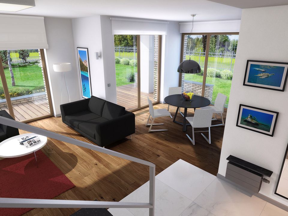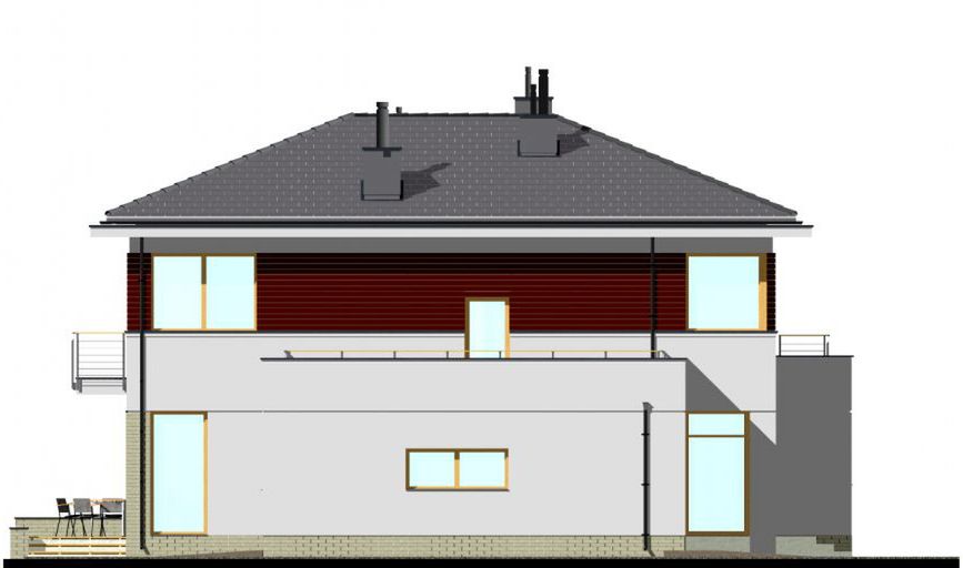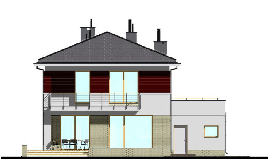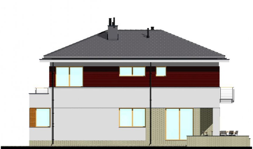 Graficzne opracowanie rzutów poglądowych widocznych na karcie projektu zostało wykonane przez Extradom.pl. Prezentowane przez Extradom.pl wizualizacje wykonane zostały przez autora projektu i należy poczytywać je jedynie za przykład i propozycję wykończenia, wizję architektoniczną autora projektu. Ostateczne wykończenie budynku może nastąpić na wiele sposobów. Szczegółowe rozwiązania zastosowane w oferowanej dokumentacji - w tym również ilość, lokalizacje i wygląd okien, drzwi, kominów - mogą w niewielkim stopniu różnić się od prezentowanej wizualizacji budynku.