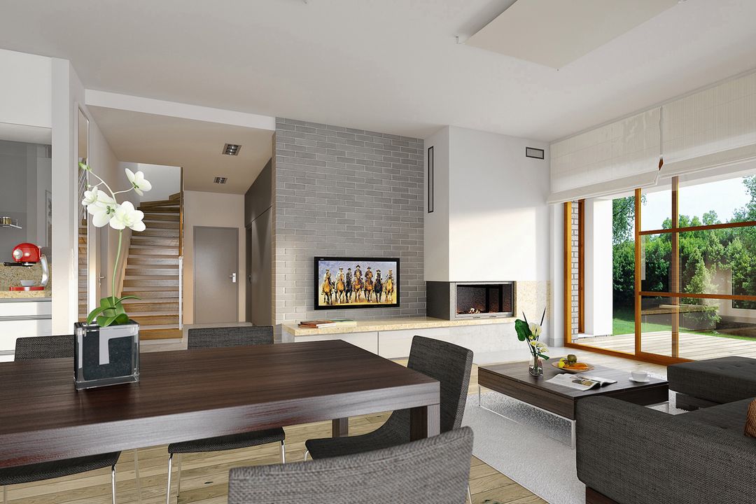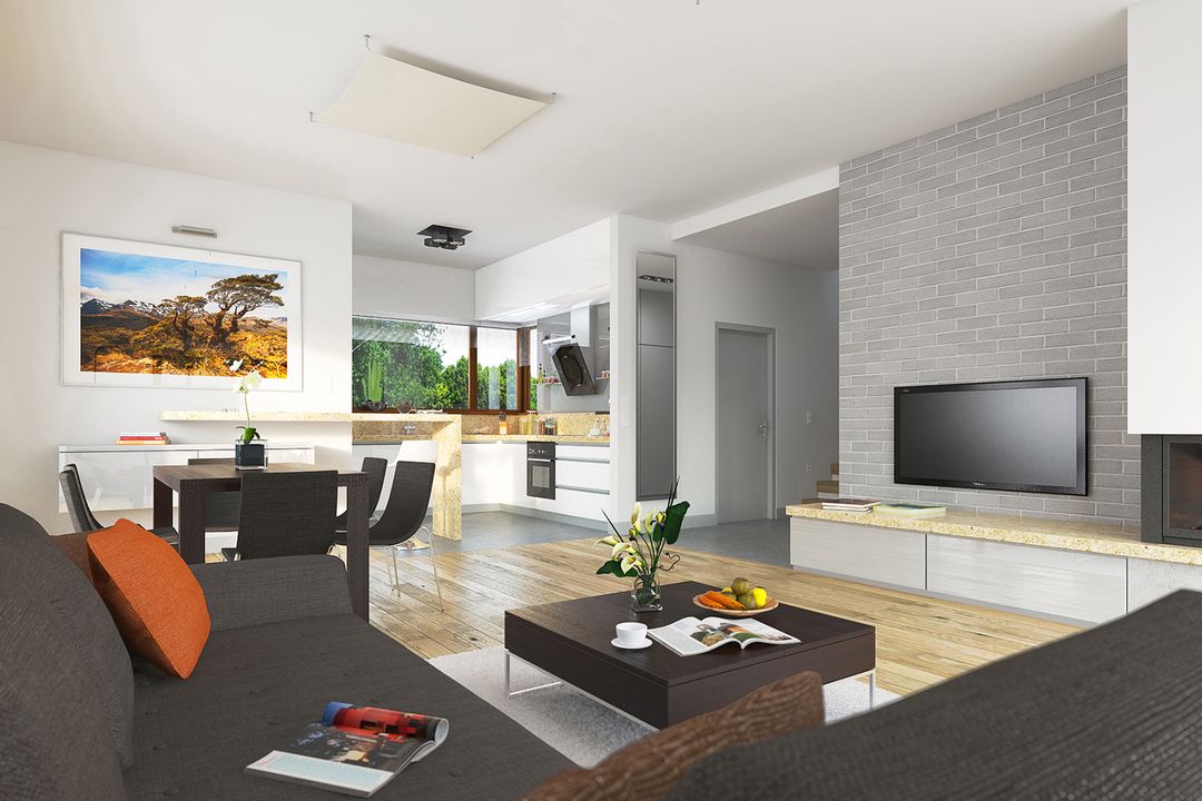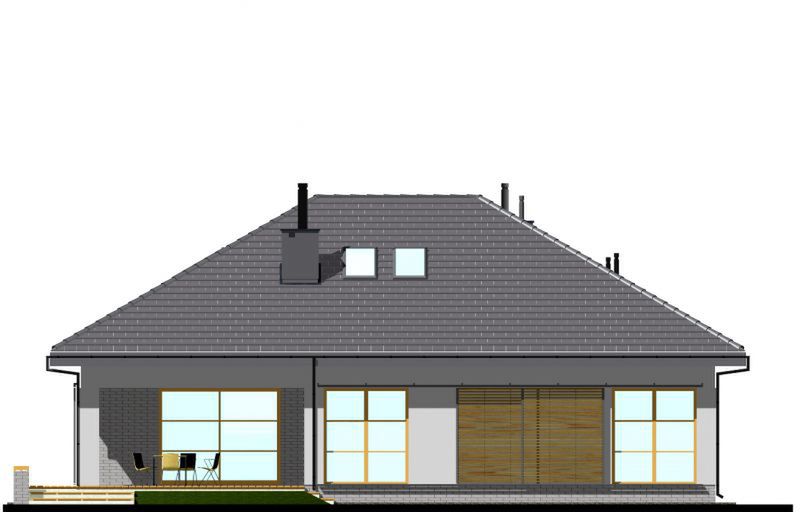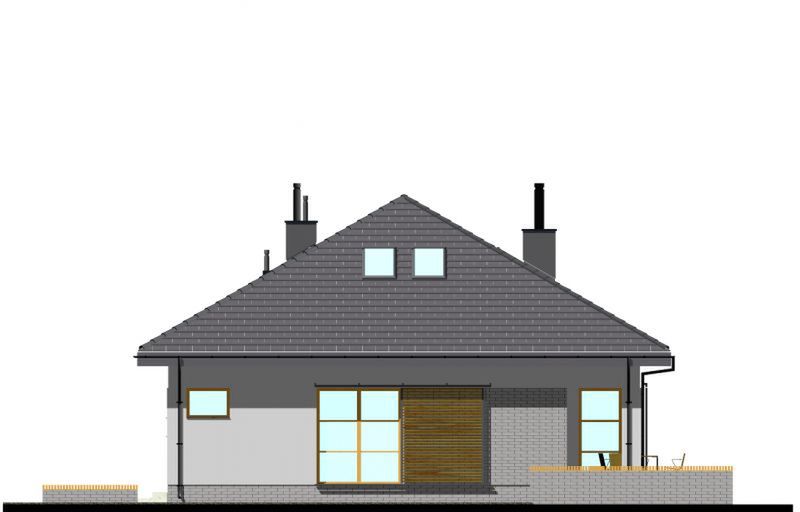 Graficzne opracowanie rzutów poglądowych widocznych na karcie projektu zostało wykonane przez Extradom.pl. Prezentowane przez Extradom.pl wizualizacje wykonane zostały przez autora projektu i należy poczytywać je jedynie za przykład i propozycję wykończenia, wizję architektoniczną autora projektu. Ostateczne wykończenie budynku może nastąpić na wiele sposobów. Szczegółowe rozwiązania zastosowane w oferowanej dokumentacji - w tym również ilość, lokalizacje i wygląd okien, drzwi, kominów - mogą w niewielkim stopniu różnić się od prezentowanej wizualizacji budynku.