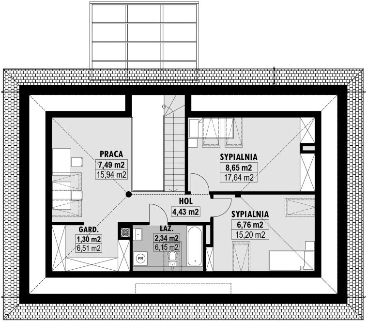 Graficzne opracowanie rzutów poglądowych widocznych na karcie projektu zostało wykonane przez Extradom.pl. Prezentowane przez Extradom.pl wizualizacje wykonane zostały przez autora projektu i należy poczytywać je jedynie za przykład i propozycję wykończenia, wizję architektoniczną autora projektu. Ostateczne wykończenie budynku może nastąpić na wiele sposobów. Szczegółowe rozwiązania zastosowane w oferowanej dokumentacji - w tym również ilość, lokalizacje i wygląd okien, drzwi, kominów - mogą w niewielkim stopniu różnić się od prezentowanej wizualizacji budynku.