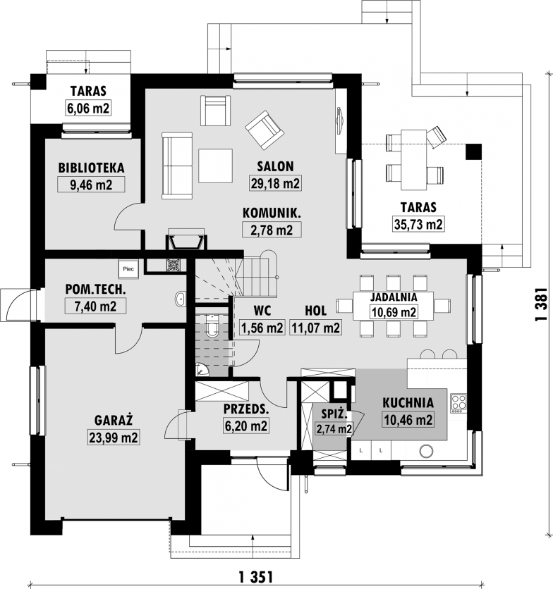 Ściany: 25cm ceramika + 18cm styropian. Strop: wylewany żelbetowy. Pokrycie dachowe: dachówka cementowa. Ocieplenie posadzki na gruncie: 20cm styropian. Ocieplenie dachu: 25-30cm wełna mineralna. Stolarka okienna: drewniana. Wykończenie zewnętrze: kamień, płytki klinkierowe lub drewno. Ogrzewanie: gazowe. Wentylacja: grawitacyjna.