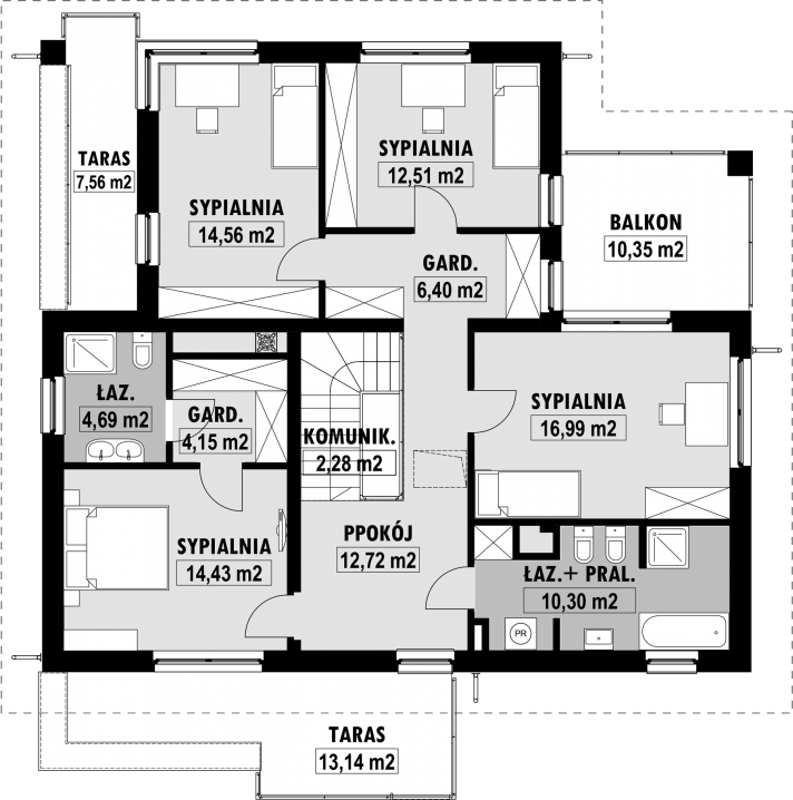 Graficzne opracowanie rzutów poglądowych widocznych na karcie projektu zostało wykonane przez Extradom.pl. Prezentowane przez Extradom.pl wizualizacje wykonane zostały przez autora projektu i należy poczytywać je jedynie za przykład i propozycję wykończenia, wizję architektoniczną autora projektu. Ostateczne wykończenie budynku może nastąpić na wiele sposobów. Szczegółowe rozwiązania zastosowane w oferowanej dokumentacji - w tym również ilość, lokalizacje i wygląd okien, drzwi, kominów - mogą w niewielkim stopniu różnić się od prezentowanej wizualizacji budynku.