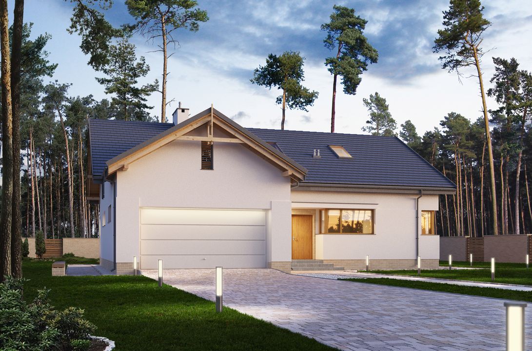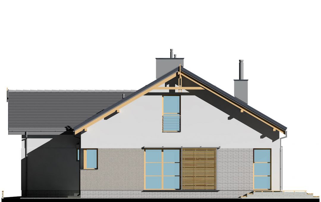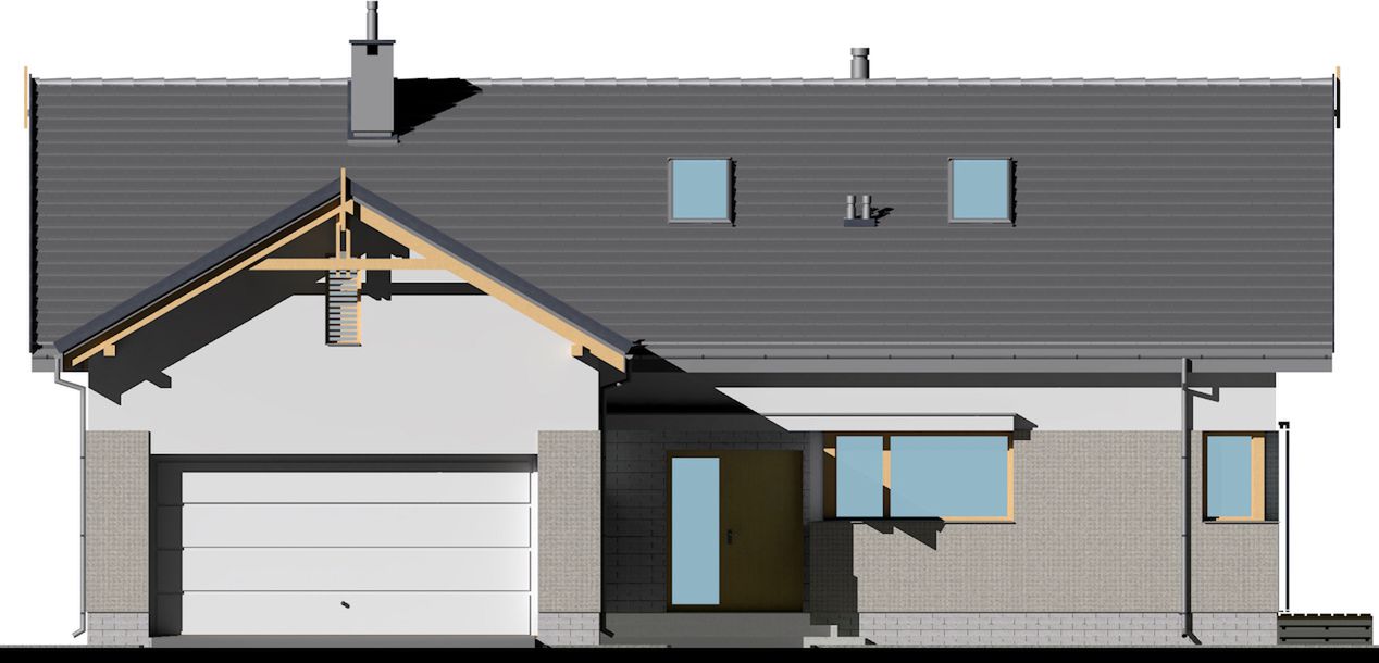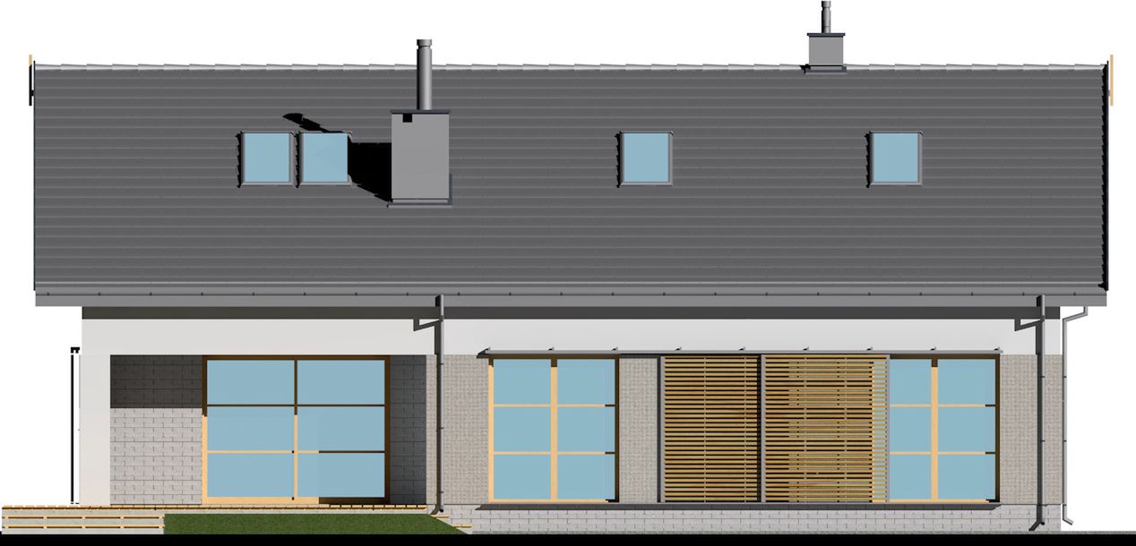 Graficzne opracowanie rzutów poglądowych widocznych na karcie projektu zostało wykonane przez Extradom.pl. Prezentowane przez Extradom.pl wizualizacje wykonane zostały przez autora projektu i należy poczytywać je jedynie za przykład i propozycję wykończenia, wizję architektoniczną autora projektu. Ostateczne wykończenie budynku może nastąpić na wiele sposobów. Szczegółowe rozwiązania zastosowane w oferowanej dokumentacji - w tym również ilość, lokalizacje i wygląd okien, drzwi, kominów - mogą w niewielkim stopniu różnić się od prezentowanej wizualizacji budynku.