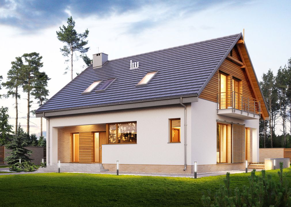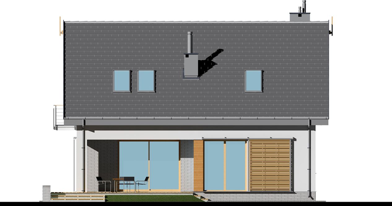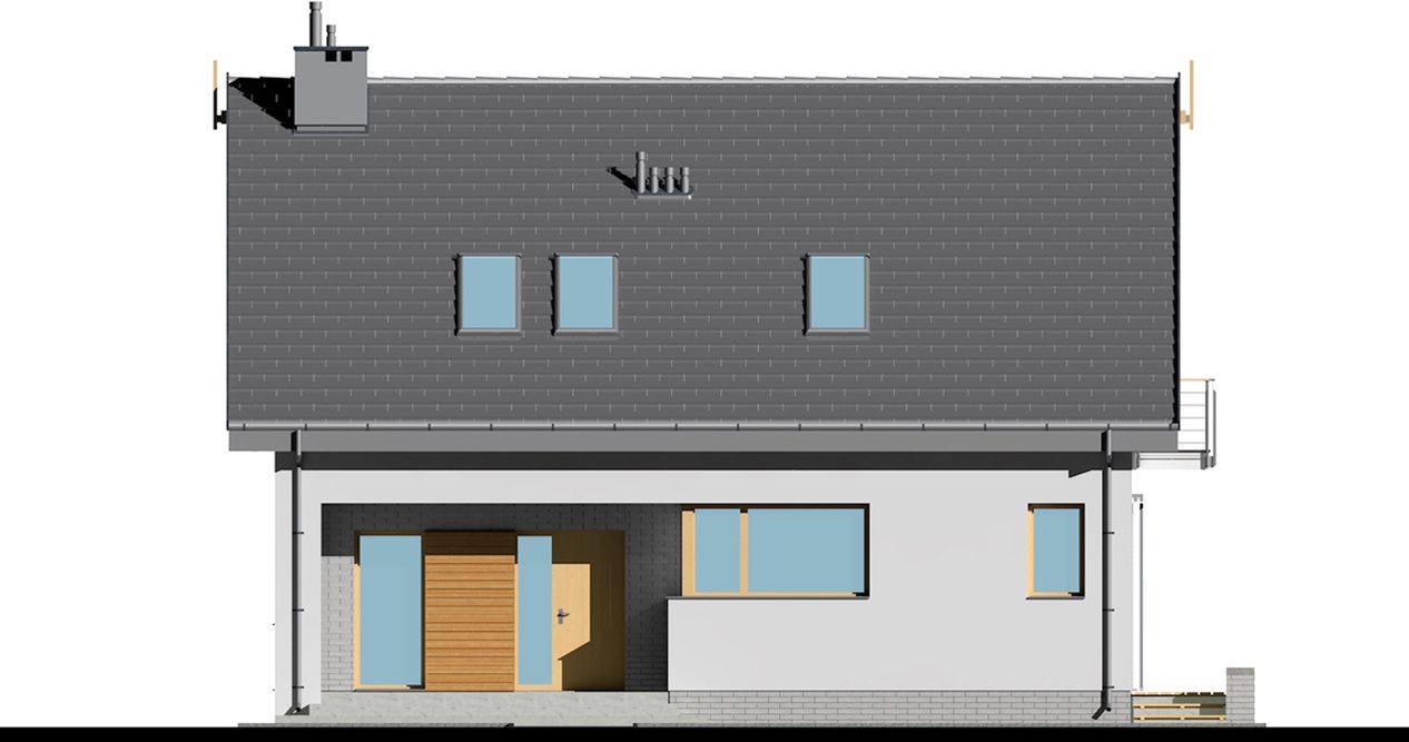 Graficzne opracowanie rzutów poglądowych widocznych na karcie projektu zostało wykonane przez Extradom.pl. Prezentowane przez Extradom.pl wizualizacje wykonane zostały przez autora projektu i należy poczytywać je jedynie za przykład i propozycję wykończenia, wizję architektoniczną autora projektu. Ostateczne wykończenie budynku może nastąpić na wiele sposobów. Szczegółowe rozwiązania zastosowane w oferowanej dokumentacji - w tym również ilość, lokalizacje i wygląd okien, drzwi, kominów - mogą w niewielkim stopniu różnić się od prezentowanej wizualizacji budynku.