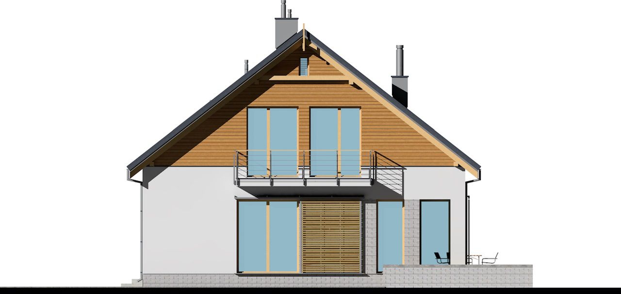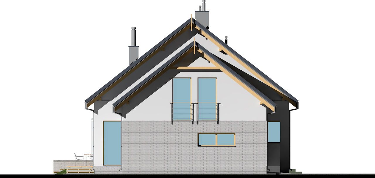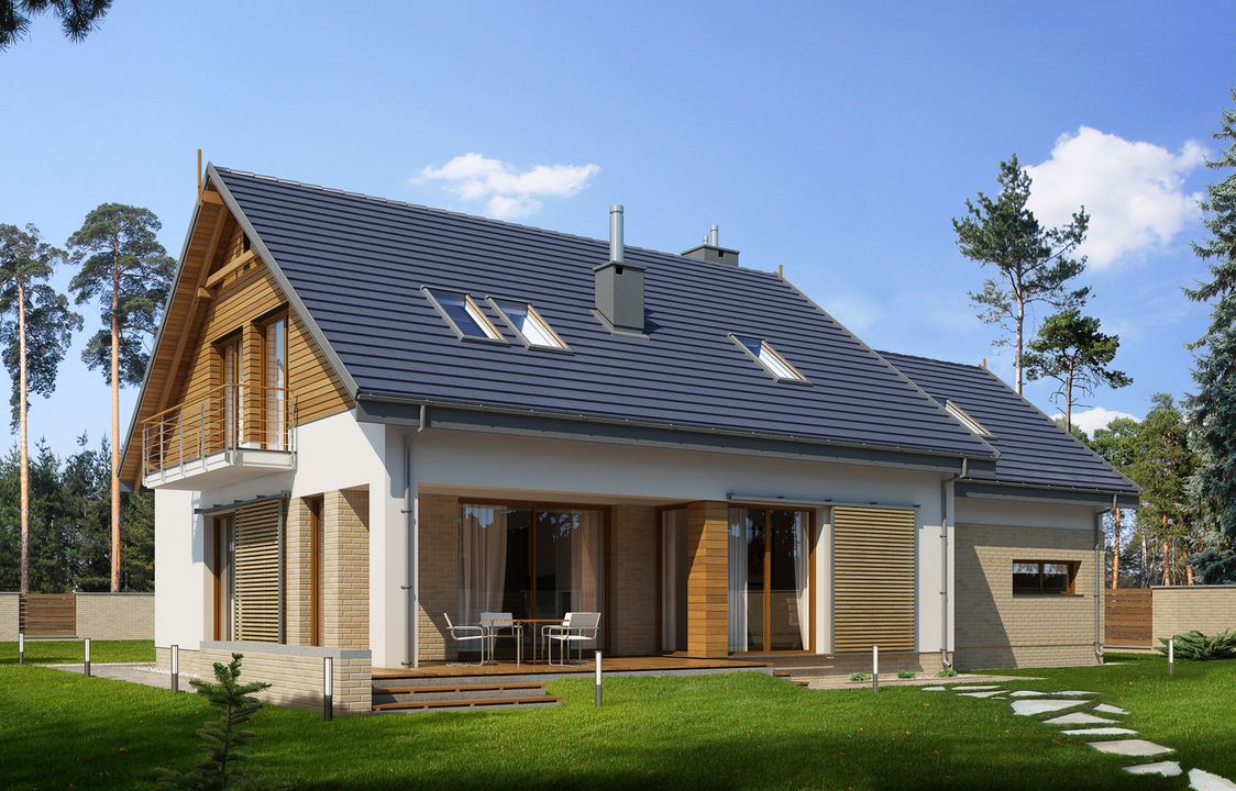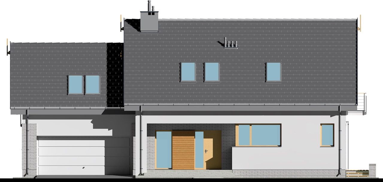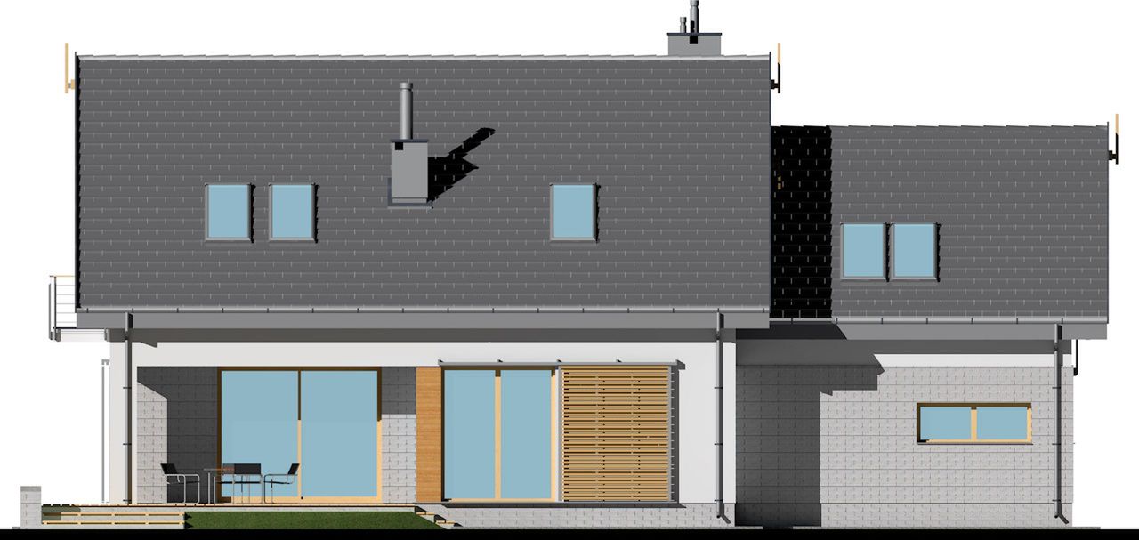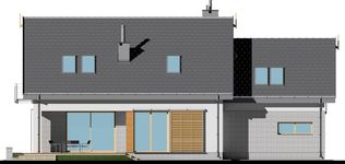 Graficzne opracowanie rzutów poglądowych widocznych na karcie projektu zostało wykonane przez Extradom.pl. Prezentowane przez Extradom.pl wizualizacje wykonane zostały przez autora projektu i należy poczytywać je jedynie za przykład i propozycję wykończenia, wizję architektoniczną autora projektu. Ostateczne wykończenie budynku może nastąpić na wiele sposobów. Szczegółowe rozwiązania zastosowane w oferowanej dokumentacji - w tym również ilość, lokalizacje i wygląd okien, drzwi, kominów - mogą w niewielkim stopniu różnić się od prezentowanej wizualizacji budynku.