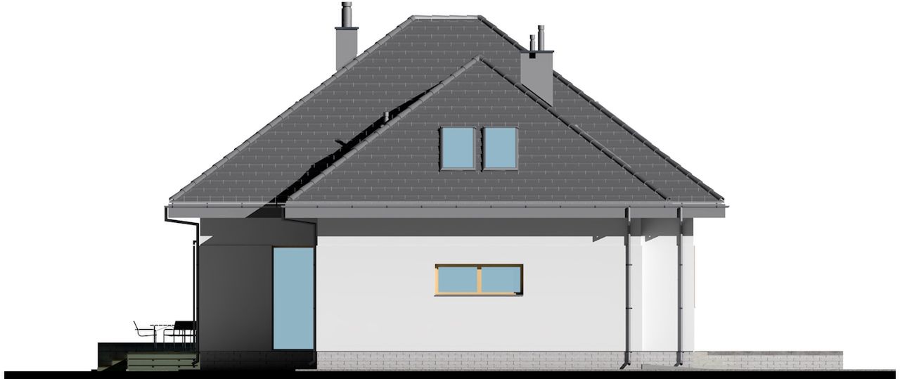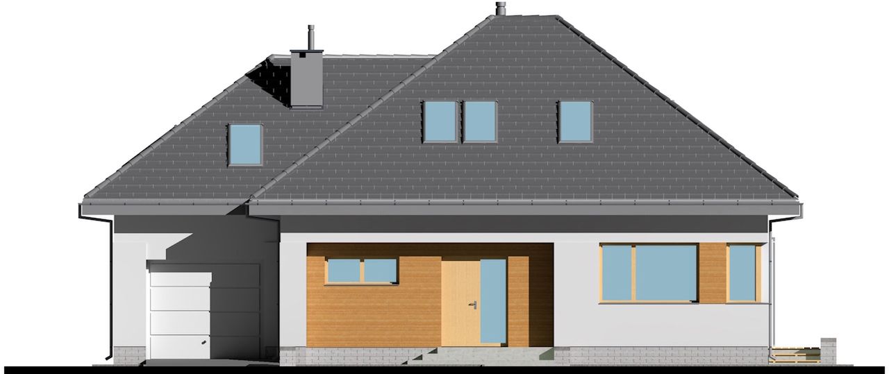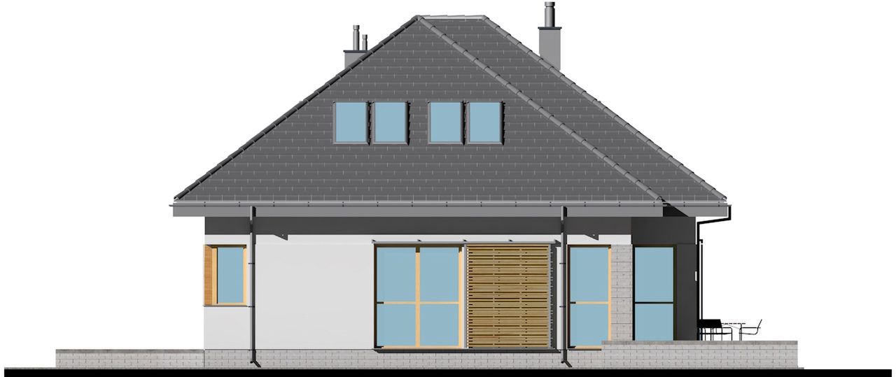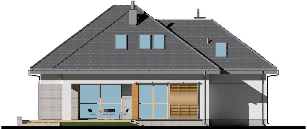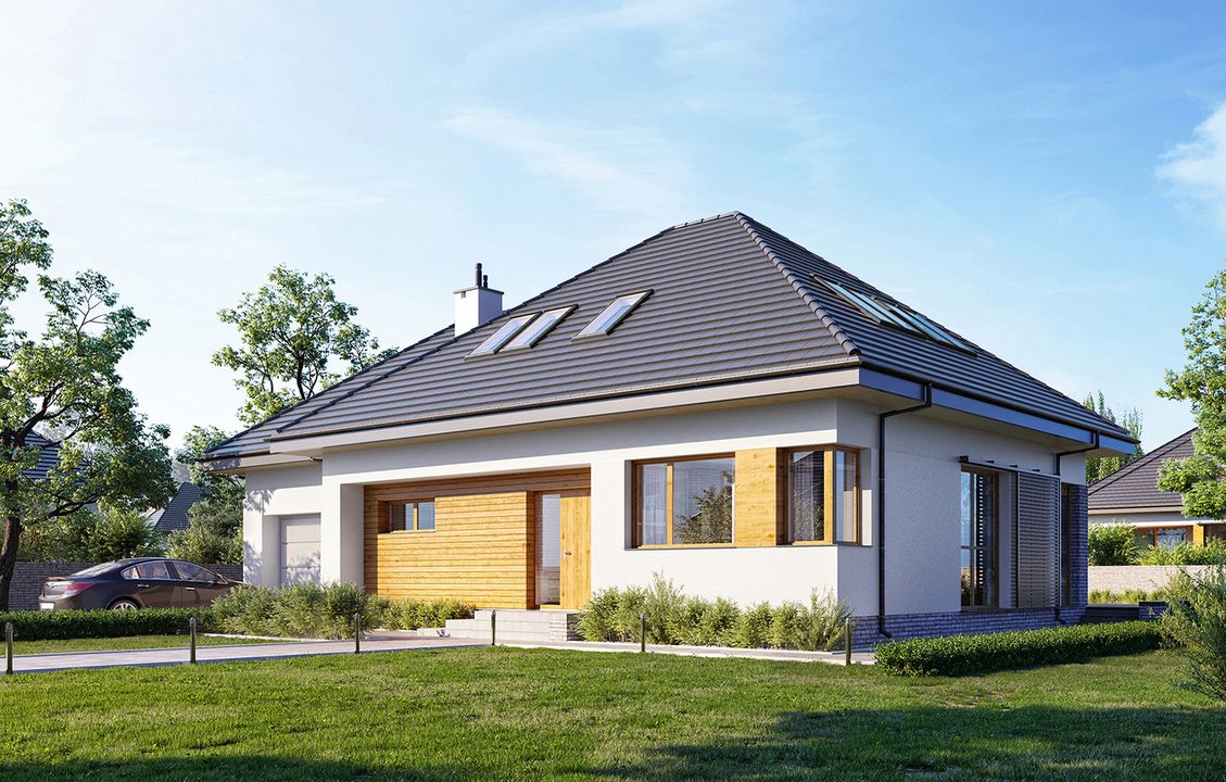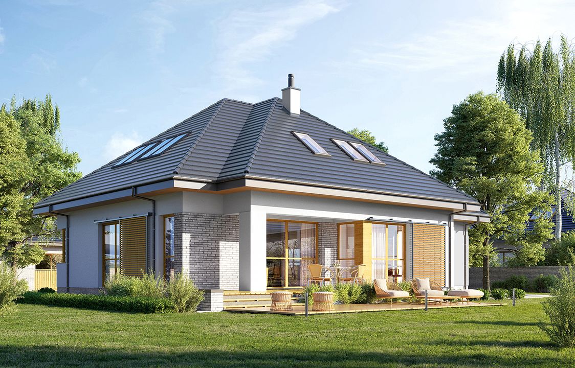 Graficzne opracowanie rzutów poglądowych widocznych na karcie projektu zostało wykonane przez Extradom.pl. Prezentowane przez Extradom.pl wizualizacje wykonane zostały przez autora projektu i należy poczytywać je jedynie za przykład i propozycję wykończenia, wizję architektoniczną autora projektu. Ostateczne wykończenie budynku może nastąpić na wiele sposobów. Szczegółowe rozwiązania zastosowane w oferowanej dokumentacji - w tym również ilość, lokalizacje i wygląd okien, drzwi, kominów - mogą w niewielkim stopniu różnić się od prezentowanej wizualizacji budynku.