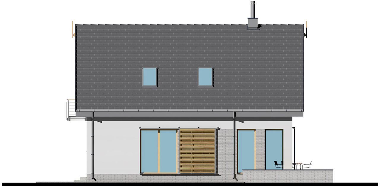 Graficzne opracowanie rzutów poglądowych widocznych na karcie projektu zostało wykonane przez Extradom.pl. Prezentowane przez Extradom.pl wizualizacje wykonane zostały przez autora projektu i należy poczytywać je jedynie za przykład i propozycję wykończenia, wizję architektoniczną autora projektu. Ostateczne wykończenie budynku może nastąpić na wiele sposobów. Szczegółowe rozwiązania zastosowane w oferowanej dokumentacji - w tym również ilość, lokalizacje i wygląd okien, drzwi, kominów - mogą w niewielkim stopniu różnić się od prezentowanej wizualizacji budynku.