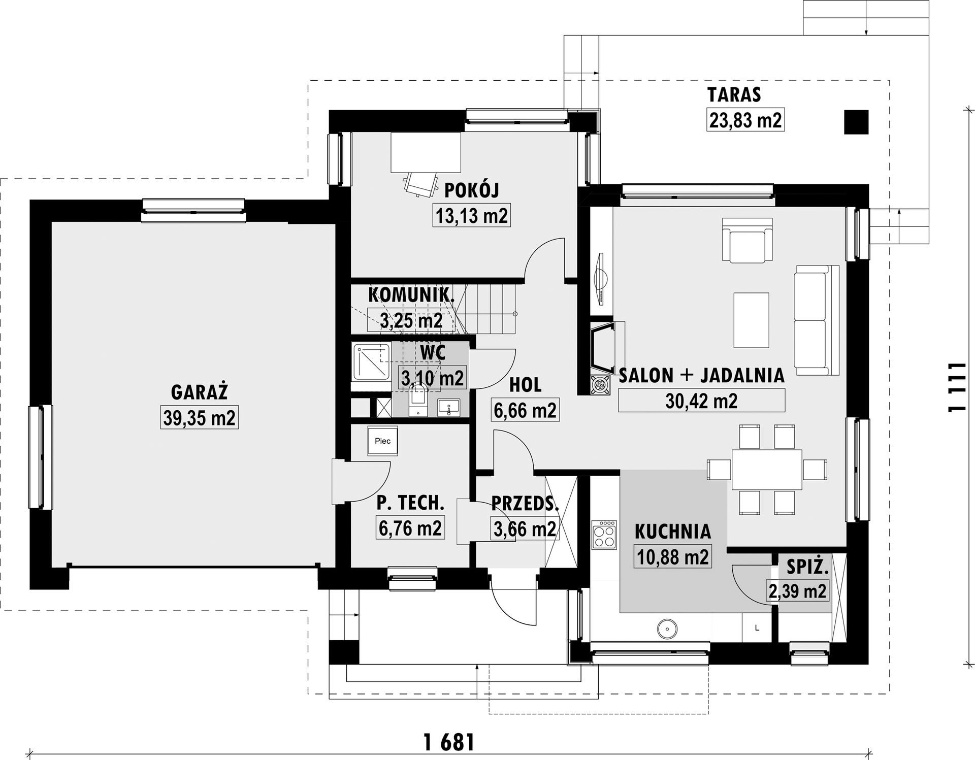 Ściany: 25cm ceramika + 18cm styropian. Strop: wylewany żelbetowy. Pokrycie dachowe: dachówka cementowa. Ocieplenie posadzki na gruncie: 20cm styropian. Ocieplenie dachu: 25-30cm wełna mineralna. Stolarka okienna: drewniana. Wykończenie zewnętrze: kamień, płytki klinkierowe lub drewno. Ogrzewanie: gazowe, grzejniki. Wentylacja: mechaniczna.