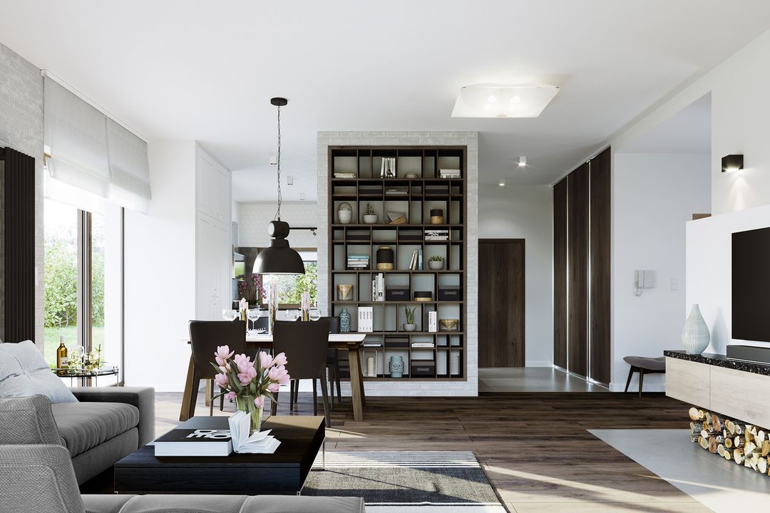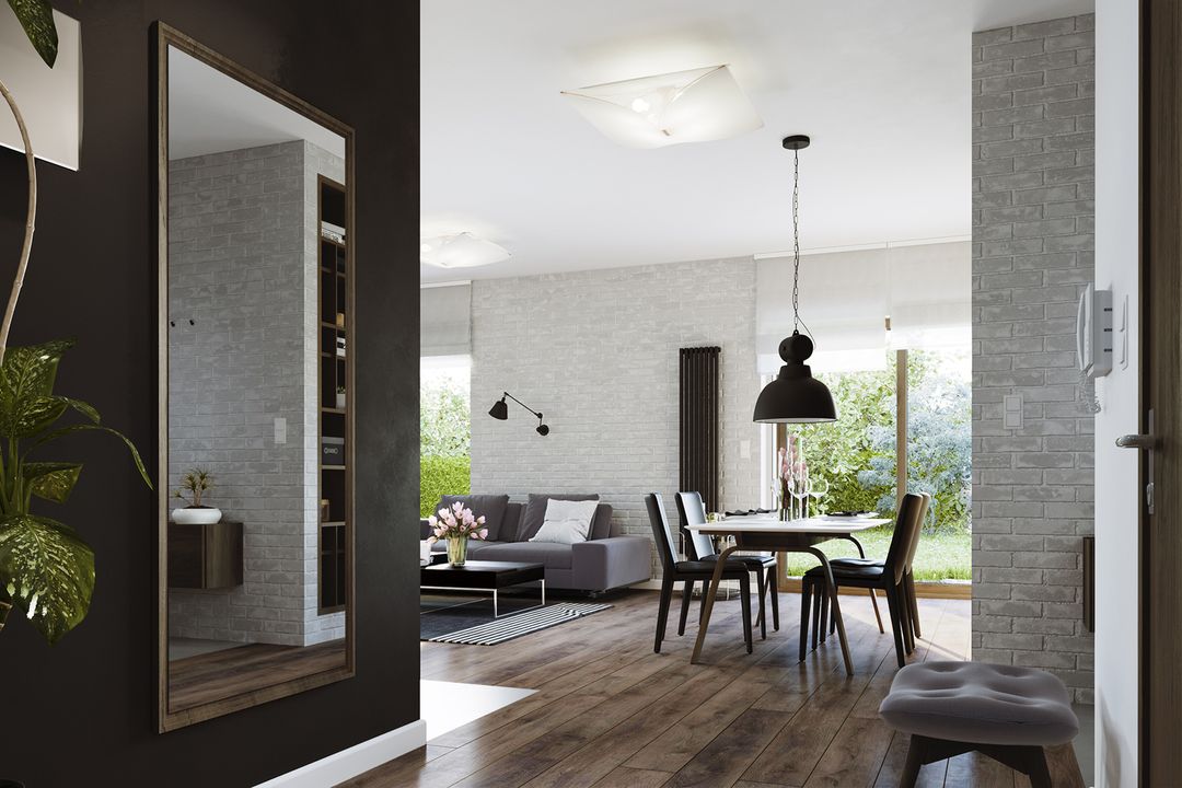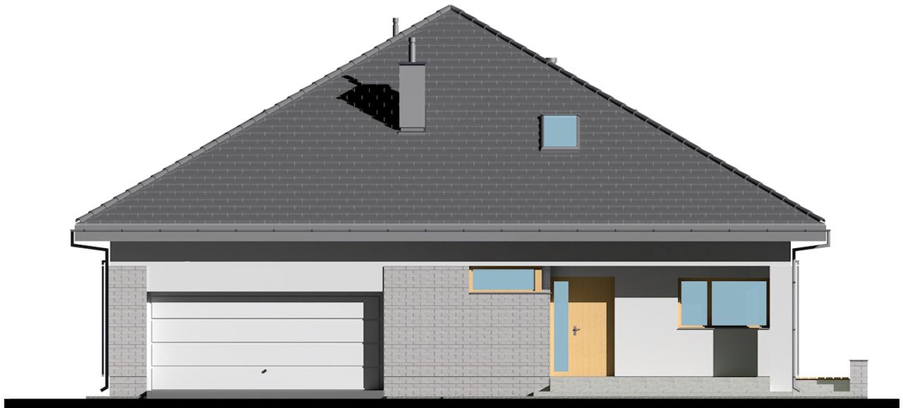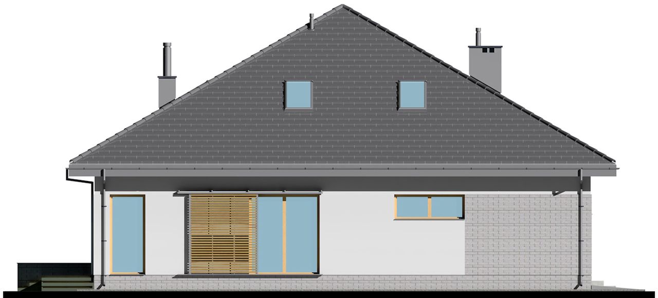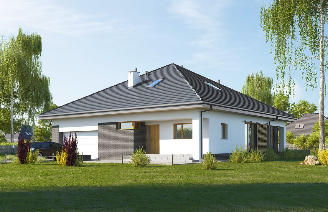 Graficzne opracowanie rzutów poglądowych widocznych na karcie projektu zostało wykonane przez Extradom.pl. Prezentowane przez Extradom.pl wizualizacje wykonane zostały przez autora projektu i należy poczytywać je jedynie za przykład i propozycję wykończenia, wizję architektoniczną autora projektu. Ostateczne wykończenie budynku może nastąpić na wiele sposobów. Szczegółowe rozwiązania zastosowane w oferowanej dokumentacji - w tym również ilość, lokalizacje i wygląd okien, drzwi, kominów - mogą w niewielkim stopniu różnić się od prezentowanej wizualizacji budynku.