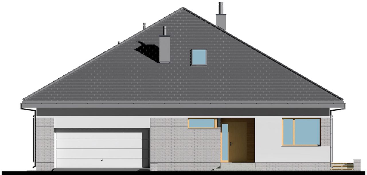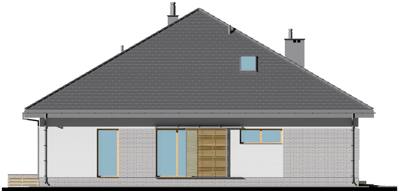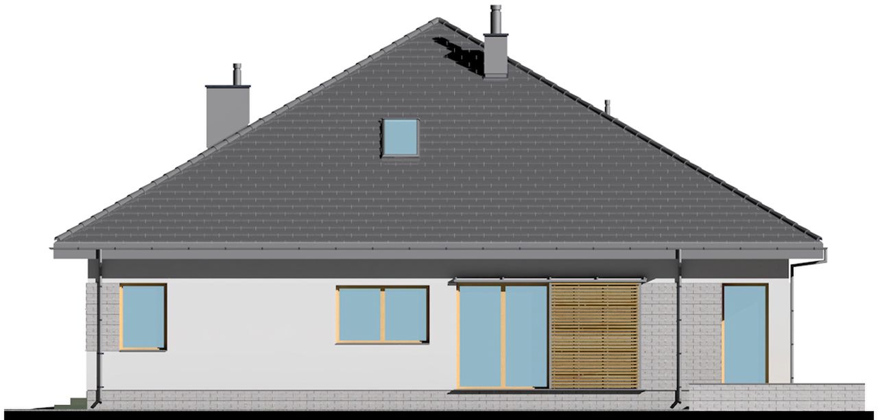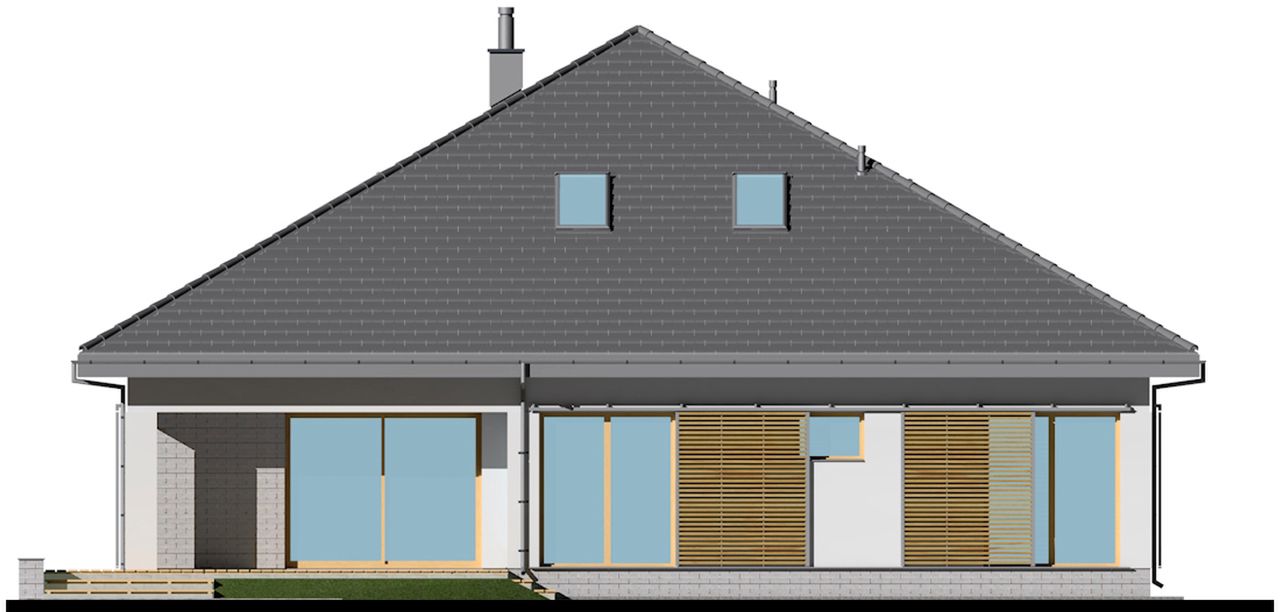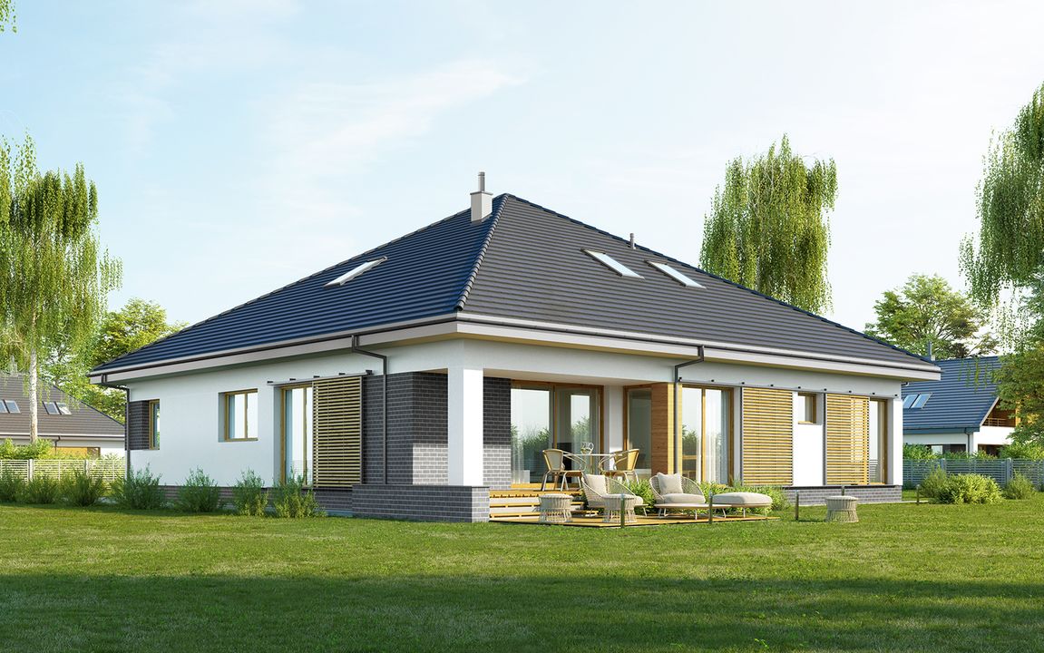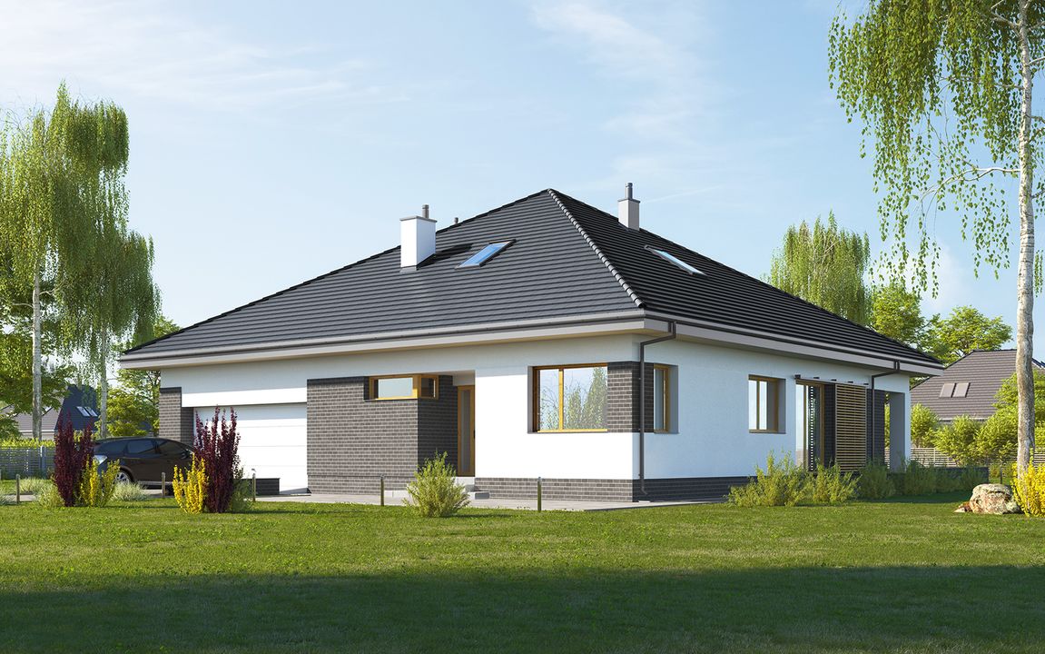 Graficzne opracowanie rzutów poglądowych widocznych na karcie projektu zostało wykonane przez Extradom.pl. Prezentowane przez Extradom.pl wizualizacje wykonane zostały przez autora projektu i należy poczytywać je jedynie za przykład i propozycję wykończenia, wizję architektoniczną autora projektu. Ostateczne wykończenie budynku może nastąpić na wiele sposobów. Szczegółowe rozwiązania zastosowane w oferowanej dokumentacji - w tym również ilość, lokalizacje i wygląd okien, drzwi, kominów - mogą w niewielkim stopniu różnić się od prezentowanej wizualizacji budynku.