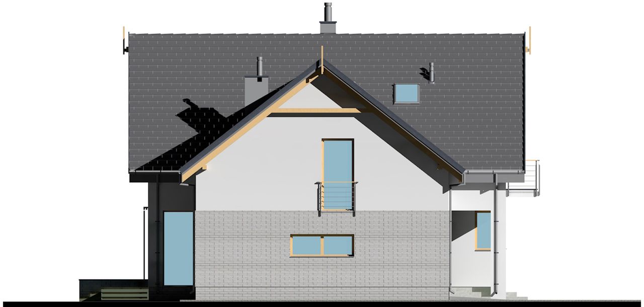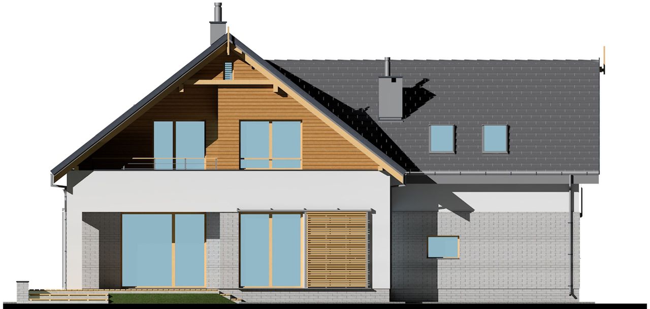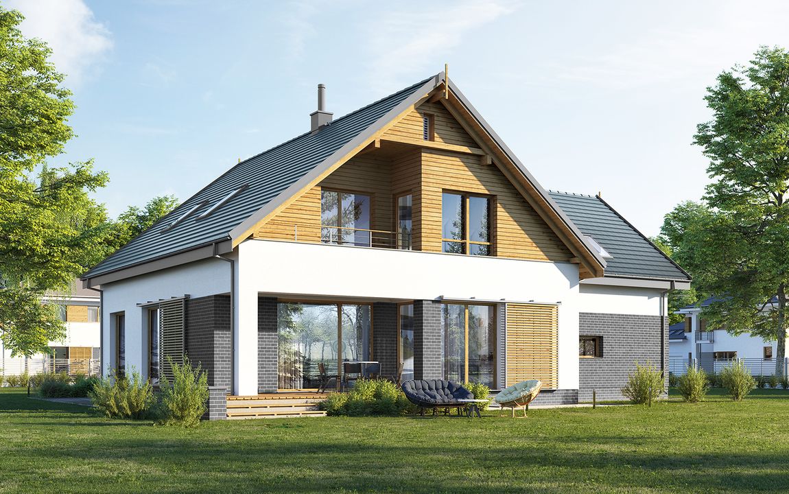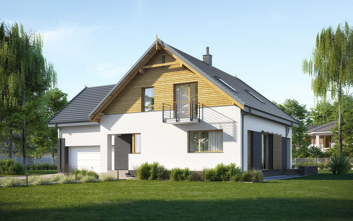 Graficzne opracowanie rzutów poglądowych widocznych na karcie projektu zostało wykonane przez Extradom.pl. Prezentowane przez Extradom.pl wizualizacje wykonane zostały przez autora projektu i należy poczytywać je jedynie za przykład i propozycję wykończenia, wizję architektoniczną autora projektu. Ostateczne wykończenie budynku może nastąpić na wiele sposobów. Szczegółowe rozwiązania zastosowane w oferowanej dokumentacji - w tym również ilość, lokalizacje i wygląd okien, drzwi, kominów - mogą w niewielkim stopniu różnić się od prezentowanej wizualizacji budynku.