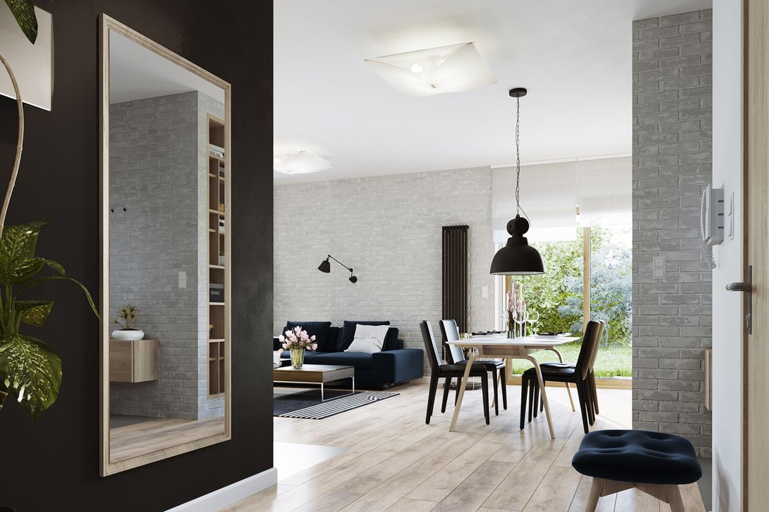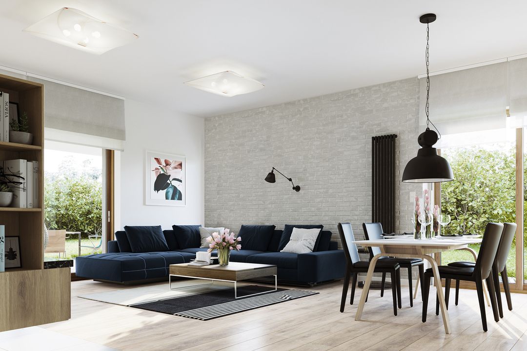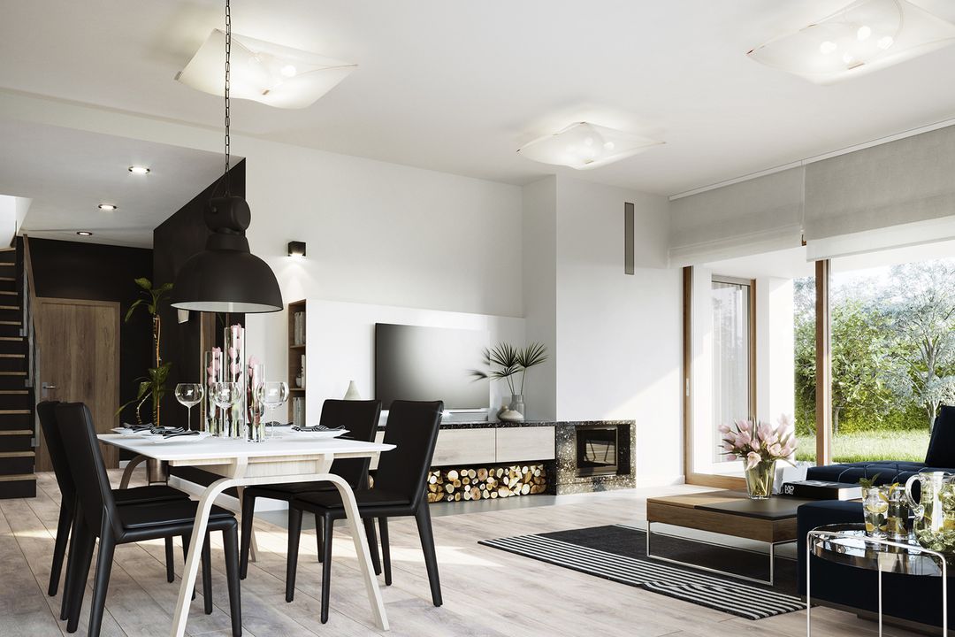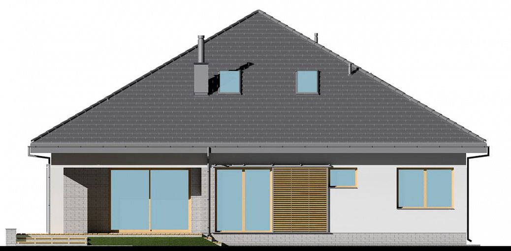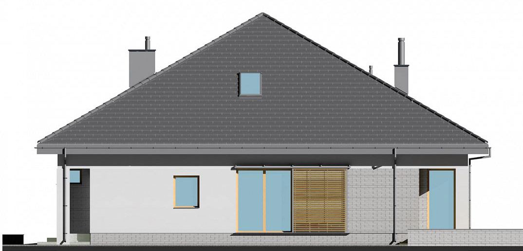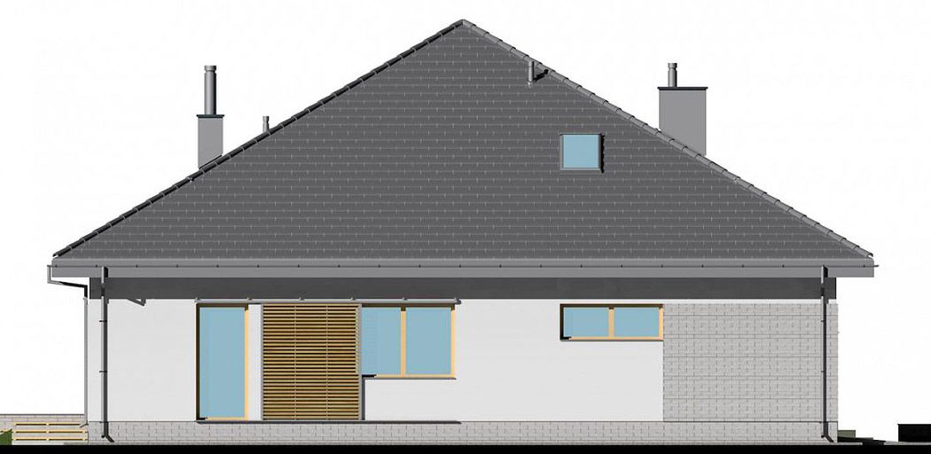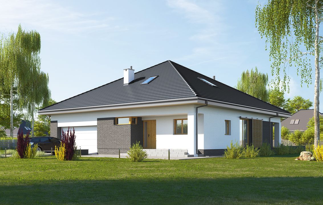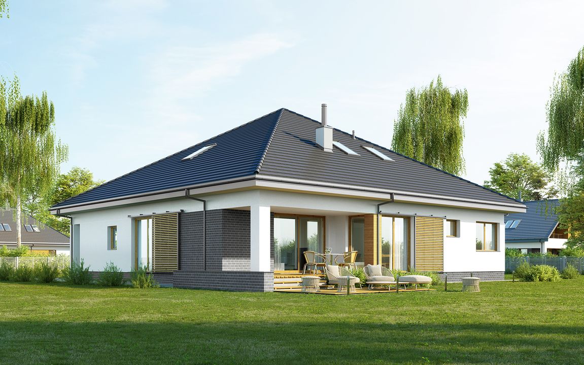 Graficzne opracowanie rzutów poglądowych widocznych na karcie projektu zostało wykonane przez Extradom.pl. Prezentowane przez Extradom.pl wizualizacje wykonane zostały przez autora projektu i należy poczytywać je jedynie za przykład i propozycję wykończenia, wizję architektoniczną autora projektu. Ostateczne wykończenie budynku może nastąpić na wiele sposobów. Szczegółowe rozwiązania zastosowane w oferowanej dokumentacji - w tym również ilość, lokalizacje i wygląd okien, drzwi, kominów - mogą w niewielkim stopniu różnić się od prezentowanej wizualizacji budynku.