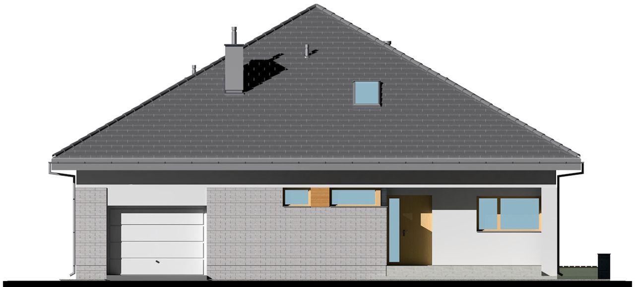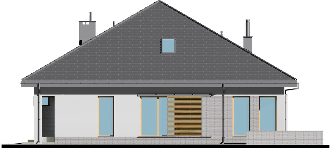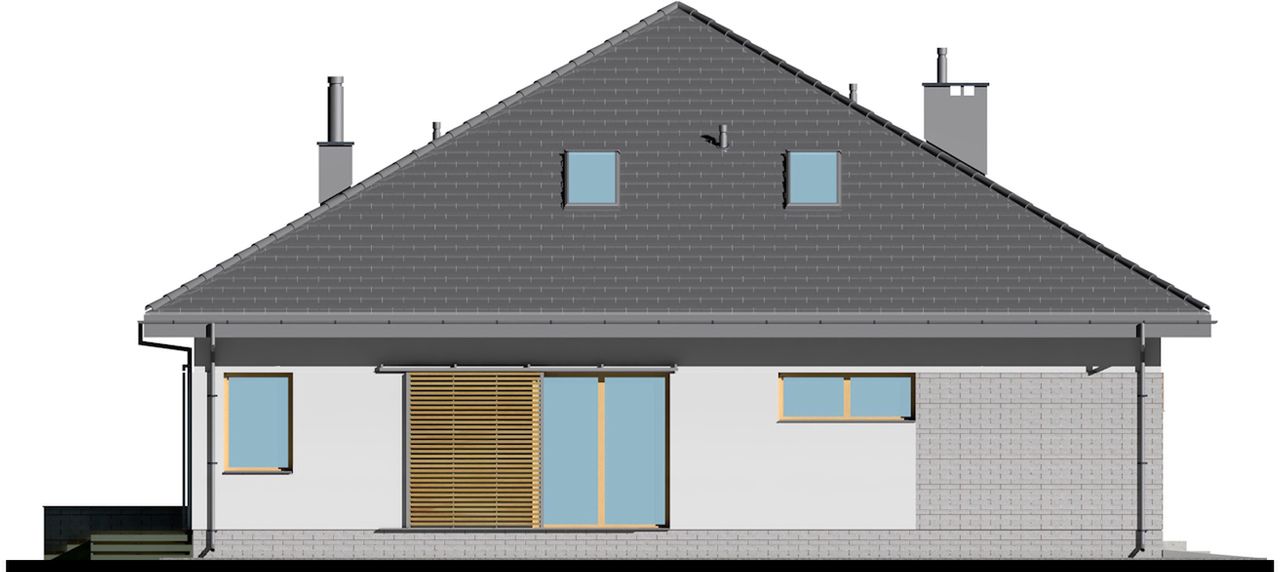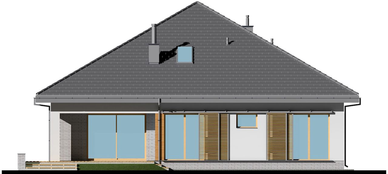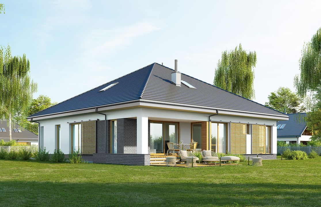 Graficzne opracowanie rzutów poglądowych widocznych na karcie projektu zostało wykonane przez Extradom.pl. Prezentowane przez Extradom.pl wizualizacje wykonane zostały przez autora projektu i należy poczytywać je jedynie za przykład i propozycję wykończenia, wizję architektoniczną autora projektu. Ostateczne wykończenie budynku może nastąpić na wiele sposobów. Szczegółowe rozwiązania zastosowane w oferowanej dokumentacji - w tym również ilość, lokalizacje i wygląd okien, drzwi, kominów - mogą w niewielkim stopniu różnić się od prezentowanej wizualizacji budynku.