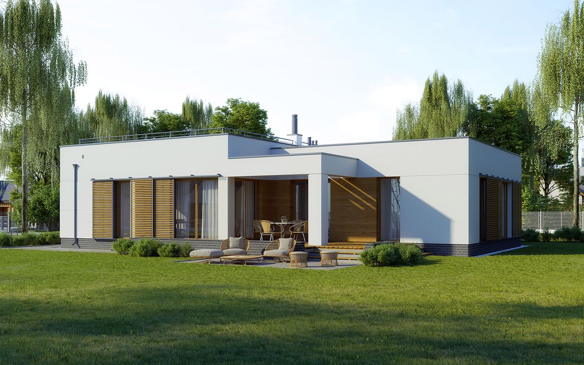 Graficzne opracowanie rzutów poglądowych widocznych na karcie projektu zostało wykonane przez Extradom.pl. Prezentowane przez Extradom.pl wizualizacje wykonane zostały przez autora projektu i należy poczytywać je jedynie za przykład i propozycję wykończenia, wizję architektoniczną autora projektu. Ostateczne wykończenie budynku może nastąpić na wiele sposobów. Szczegółowe rozwiązania zastosowane w oferowanej dokumentacji - w tym również ilość, lokalizacje i wygląd okien, drzwi, kominów - mogą w niewielkim stopniu różnić się od prezentowanej wizualizacji budynku.