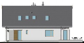 Graficzne opracowanie rzutów poglądowych widocznych na karcie projektu zostało wykonane przez Extradom.pl. Prezentowane przez Extradom.pl wizualizacje wykonane zostały przez autora projektu i należy poczytywać je jedynie za przykład i propozycję wykończenia, wizję architektoniczną autora projektu. Ostateczne wykończenie budynku może nastąpić na wiele sposobów. Szczegółowe rozwiązania zastosowane w oferowanej dokumentacji - w tym również ilość, lokalizacje i wygląd okien, drzwi, kominów - mogą w niewielkim stopniu różnić się od prezentowanej wizualizacji budynku.