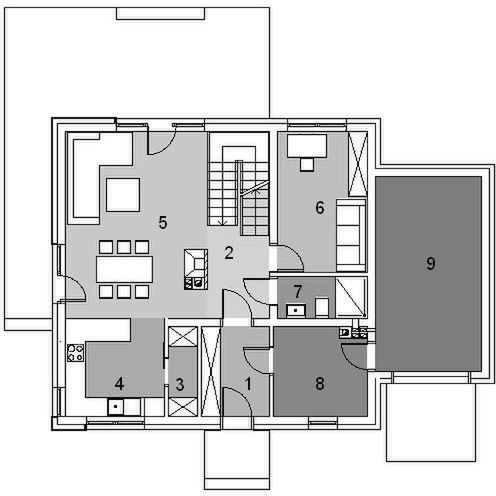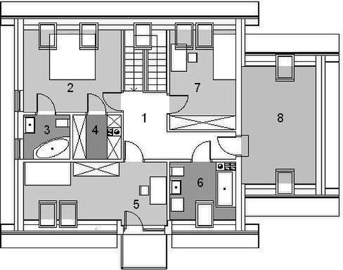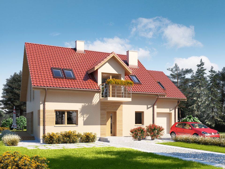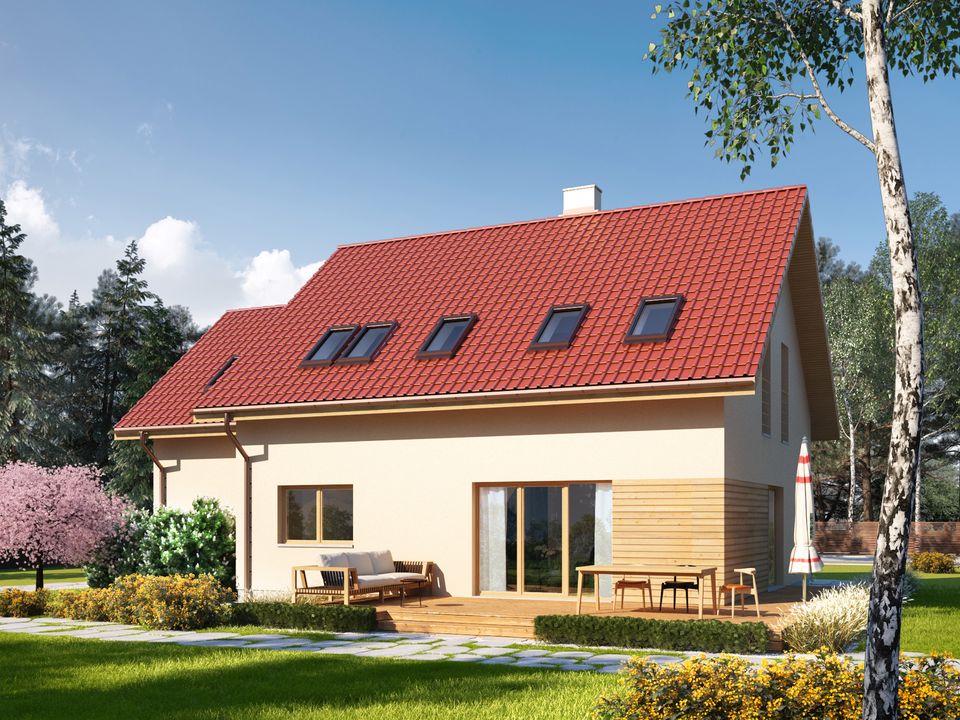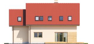 Graficzne opracowanie rzutów poglądowych widocznych na karcie projektu zostało wykonane przez Extradom.pl. Prezentowane przez Extradom.pl wizualizacje wykonane zostały przez autora projektu i należy poczytywać je jedynie za przykład i propozycję wykończenia, wizję architektoniczną autora projektu. Ostateczne wykończenie budynku może nastąpić na wiele sposobów. Szczegółowe rozwiązania zastosowane w oferowanej dokumentacji - w tym również ilość, lokalizacje i wygląd okien, drzwi, kominów - mogą w niewielkim stopniu różnić się od prezentowanej wizualizacji budynku.