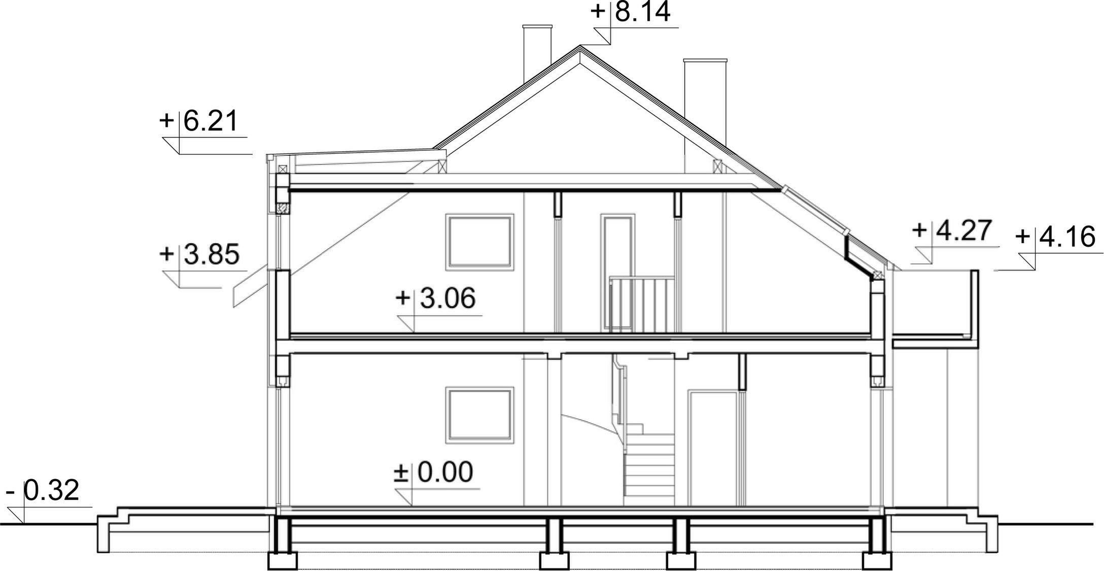 Ściany: bloczek z betonu komórkowego Ytong ENERGO24 cm, wełna Isover TF PROFI, tynk. Strop: Teriva. Dach: dwuspadowy nachylnie 35', tradycyjna więźba, dachówka betonowa lub ceramiczna, okno dachowe VELUX. Ogrzewanie: gazowe. Wentylacja: grawitacyjna.