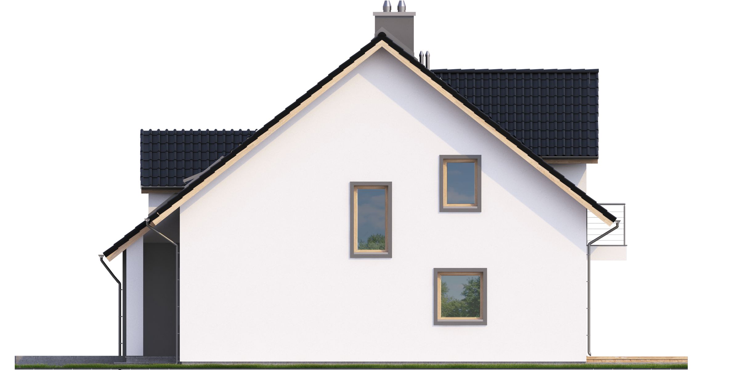 Graficzne opracowanie rzutów poglądowych widocznych na karcie projektu zostało wykonane przez Extradom.pl. Prezentowane przez Extradom.pl wizualizacje wykonane zostały przez autora projektu i należy poczytywać je jedynie za przykład i propozycję wykończenia, wizję architektoniczną autora projektu. Ostateczne wykończenie budynku może nastąpić na wiele sposobów. Szczegółowe rozwiązania zastosowane w oferowanej dokumentacji - w tym również ilość, lokalizacje i wygląd okien, drzwi, kominów - mogą w niewielkim stopniu różnić się od prezentowanej wizualizacji budynku.