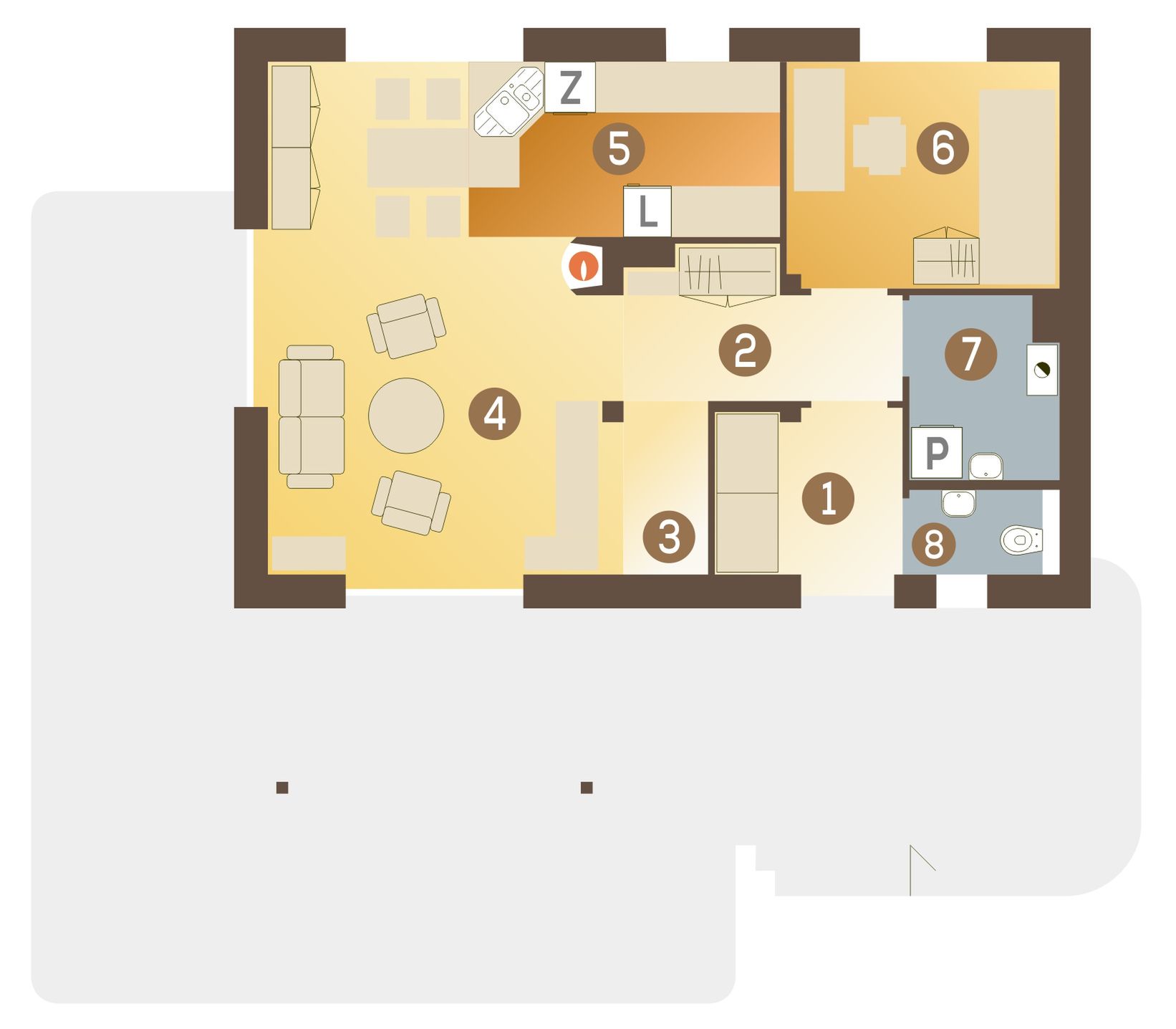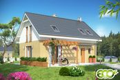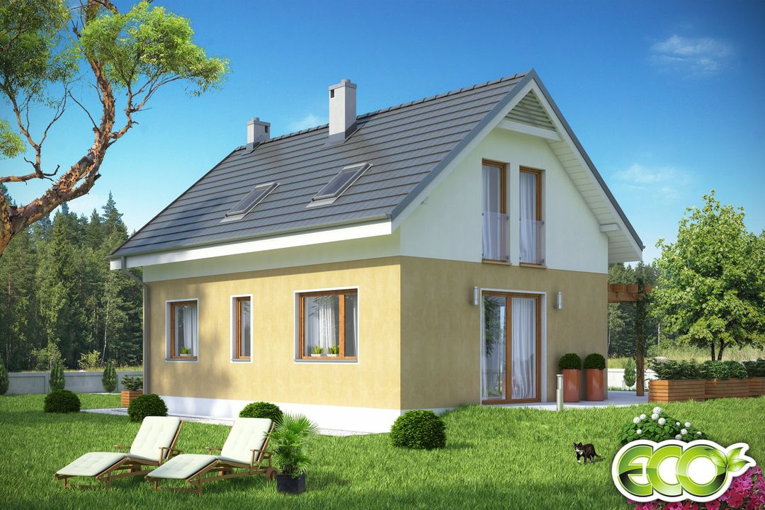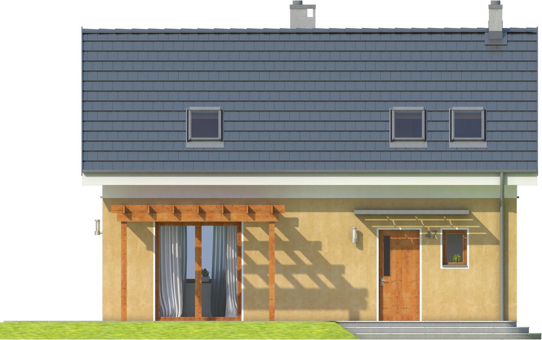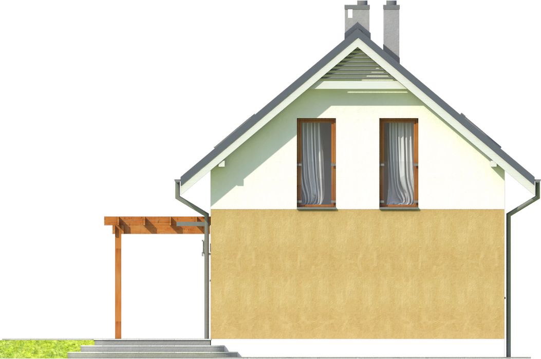 Graficzne opracowanie rzutów poglądowych widocznych na karcie projektu zostało wykonane przez Extradom.pl. Prezentowane przez Extradom.pl wizualizacje wykonane zostały przez autora projektu i należy poczytywać je jedynie za przykład i propozycję wykończenia, wizję architektoniczną autora projektu. Ostateczne wykończenie budynku może nastąpić na wiele sposobów. Szczegółowe rozwiązania zastosowane w oferowanej dokumentacji - w tym również ilość, lokalizacje i wygląd okien, drzwi, kominów - mogą w niewielkim stopniu różnić się od prezentowanej wizualizacji budynku.