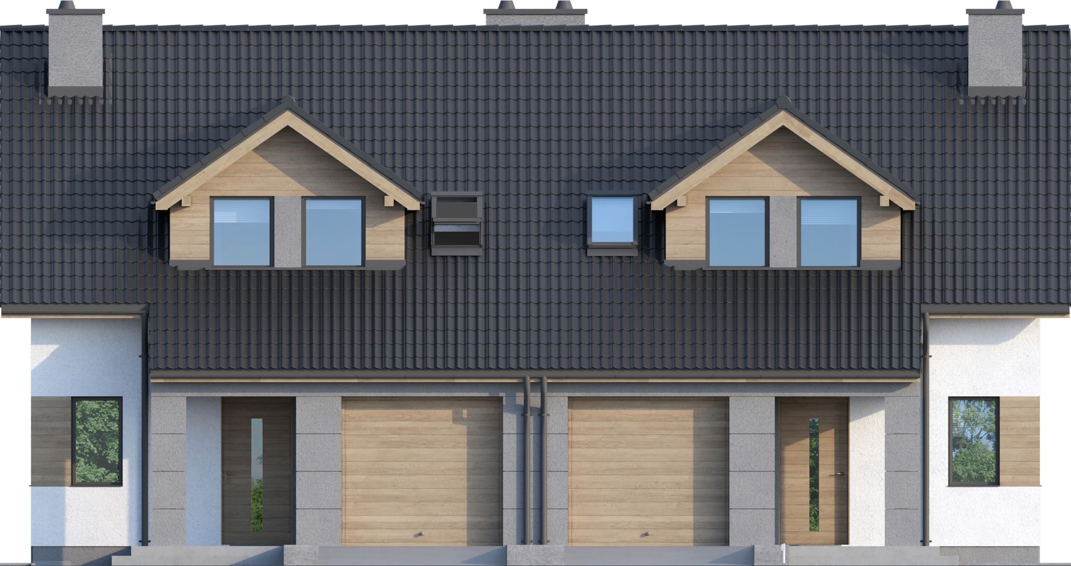 Projekt dostępny w konfiguracjach: bliźniak z segmentami lewym i prawym na osobnych dokumentacjach albo bliźniak na jednej dokumentacji albo jednorodzinny dwulokalowy.