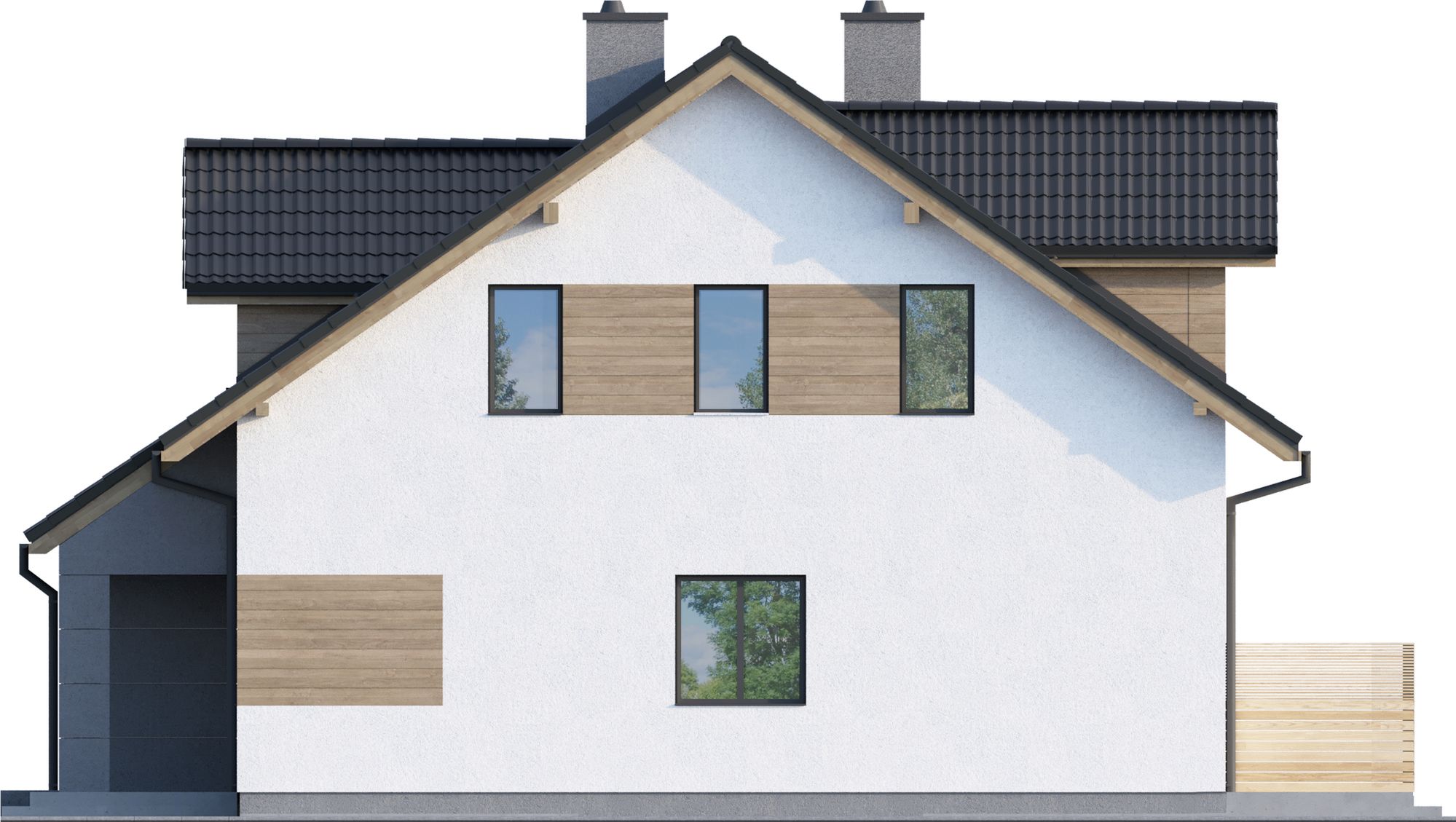 Graficzne opracowanie rzutów poglądowych widocznych na karcie projektu zostało wykonane przez Extradom.pl. Prezentowane przez Extradom.pl wizualizacje wykonane zostały przez autora projektu i należy poczytywać je jedynie za przykład i propozycję wykończenia, wizję architektoniczną autora projektu. Ostateczne wykończenie budynku może nastąpić na wiele sposobów. Szczegółowe rozwiązania zastosowane w oferowanej dokumentacji - w tym również ilość, lokalizacje i wygląd okien, drzwi, kominów - mogą w niewielkim stopniu różnić się od prezentowanej wizualizacji budynku.
