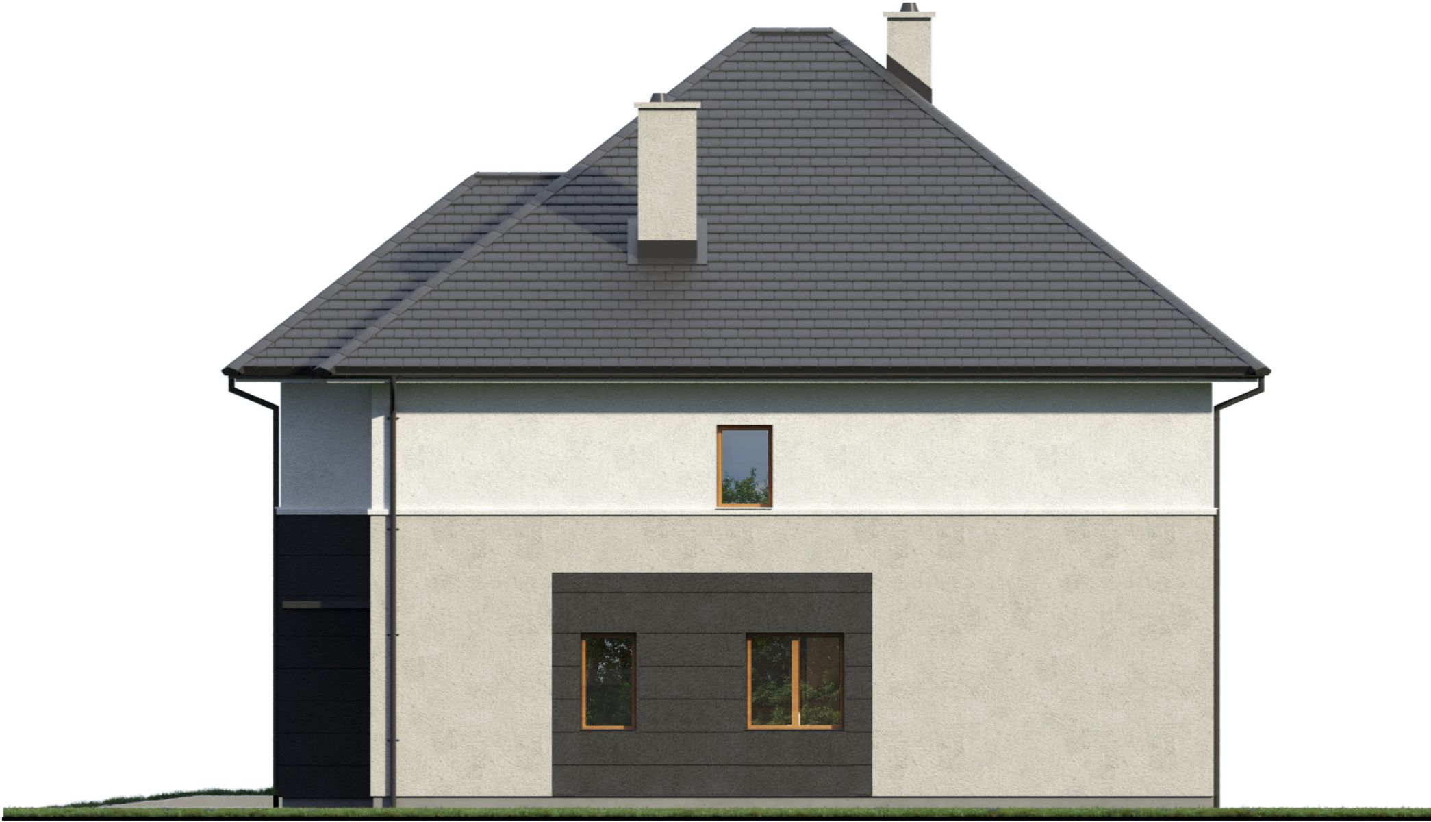 Graficzne opracowanie rzutów poglądowych widocznych na karcie projektu zostało wykonane przez Extradom.pl. Prezentowane przez Extradom.pl wizualizacje wykonane zostały przez autora projektu i należy poczytywać je jedynie za przykład i propozycję wykończenia, wizję architektoniczną autora projektu. Ostateczne wykończenie budynku może nastąpić na wiele sposobów. Szczegółowe rozwiązania zastosowane w oferowanej dokumentacji - w tym również ilość, lokalizacje i wygląd okien, drzwi, kominów - mogą w niewielkim stopniu różnić się od prezentowanej wizualizacji budynku.