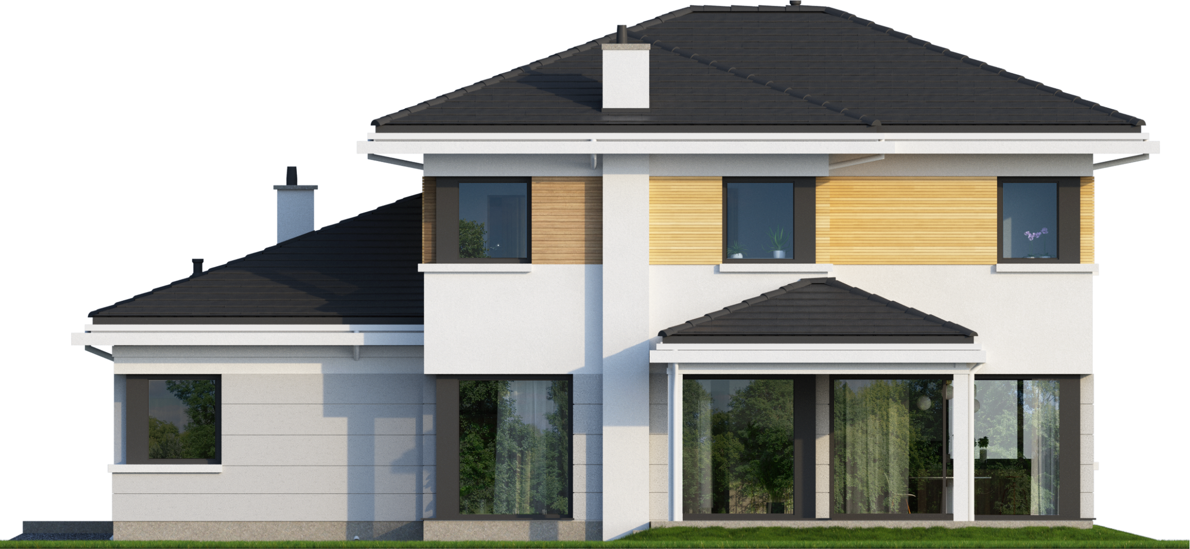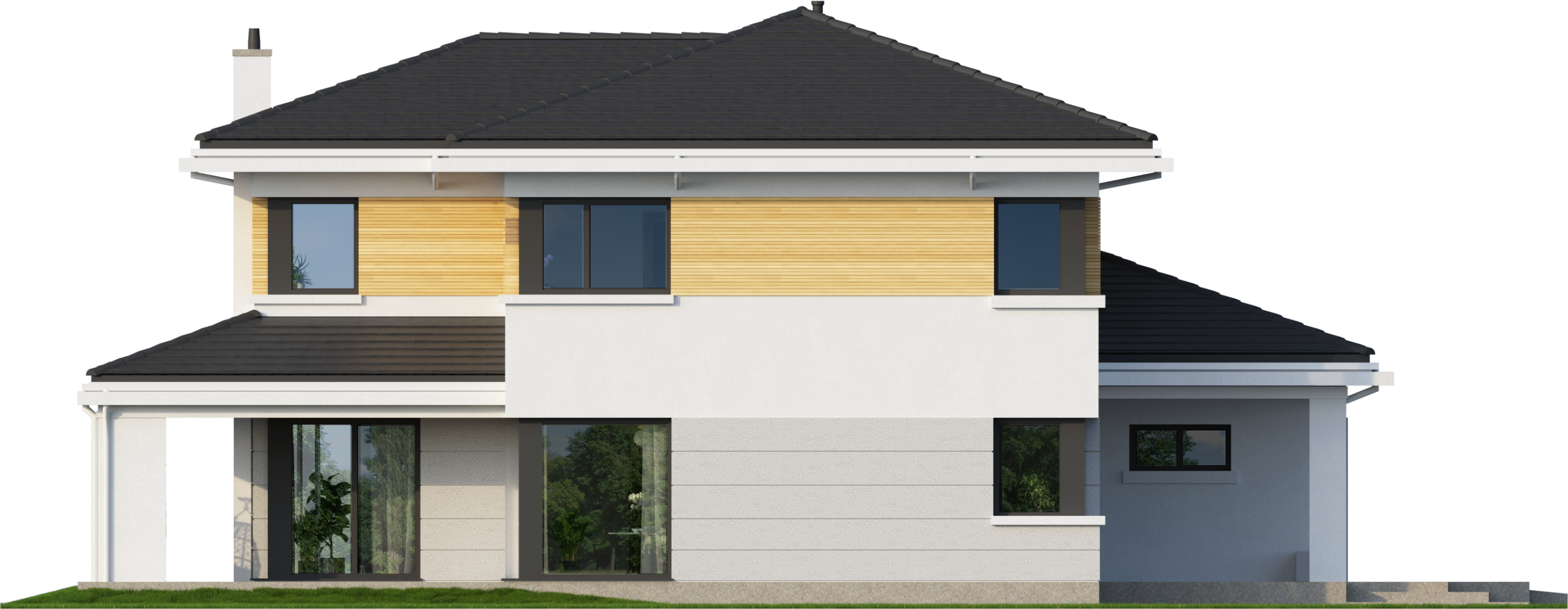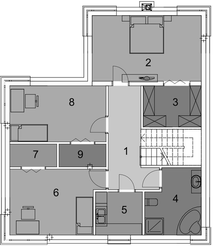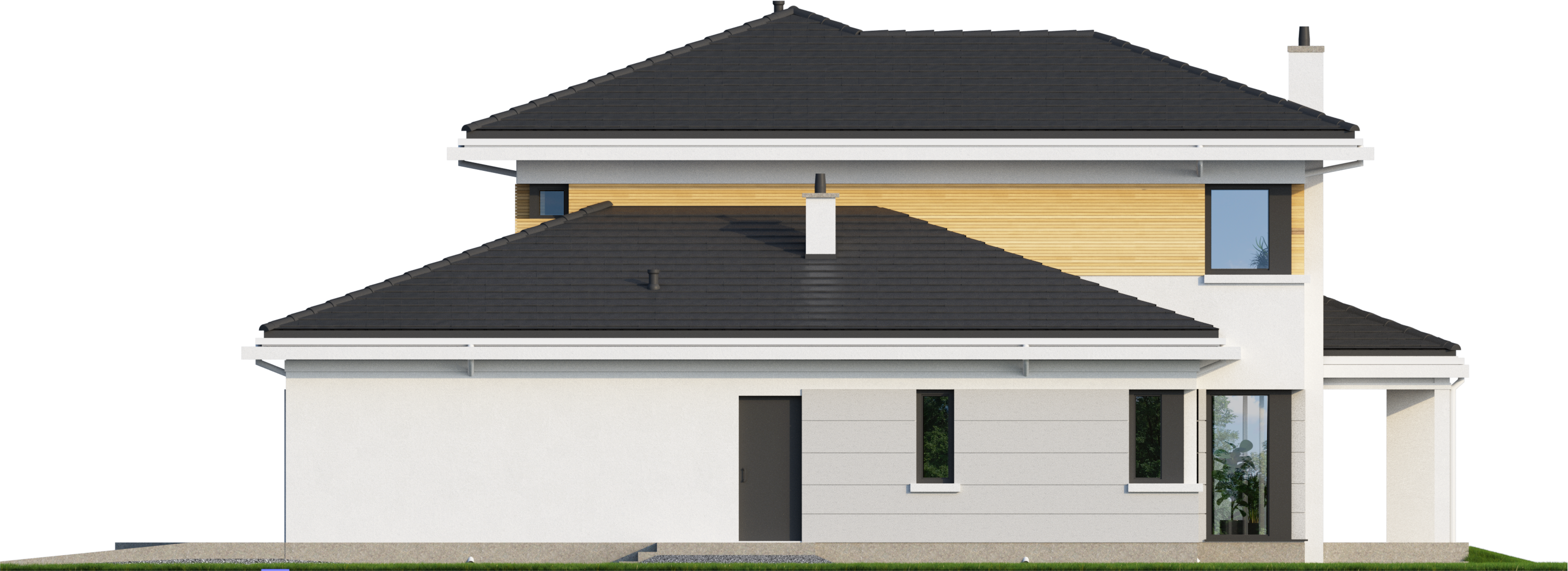 Graficzne opracowanie rzutów poglądowych widocznych na karcie projektu zostało wykonane przez Extradom.pl. Prezentowane przez Extradom.pl wizualizacje wykonane zostały przez autora projektu i należy poczytywać je jedynie za przykład i propozycję wykończenia, wizję architektoniczną autora projektu. Ostateczne wykończenie budynku może nastąpić na wiele sposobów. Szczegółowe rozwiązania zastosowane w oferowanej dokumentacji - w tym również ilość, lokalizacje i wygląd okien, drzwi, kominów - mogą w niewielkim stopniu różnić się od prezentowanej wizualizacji budynku.