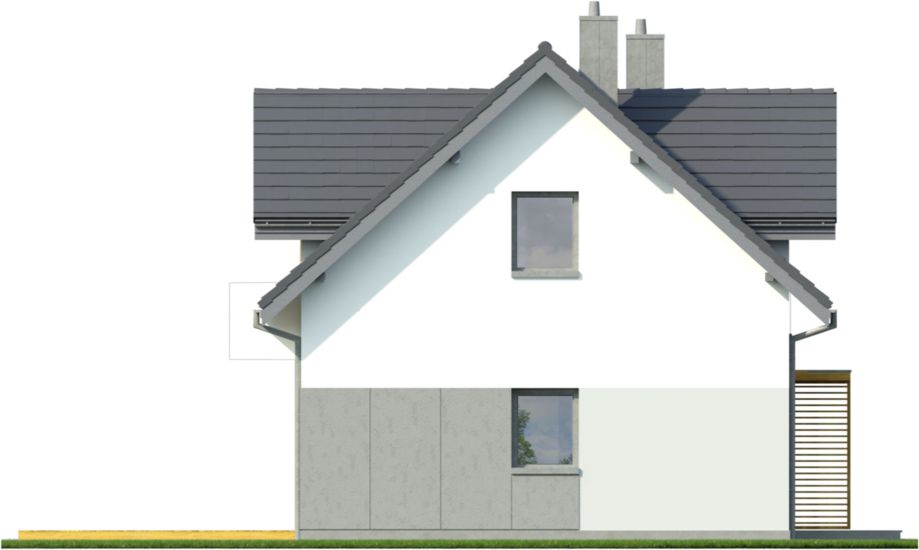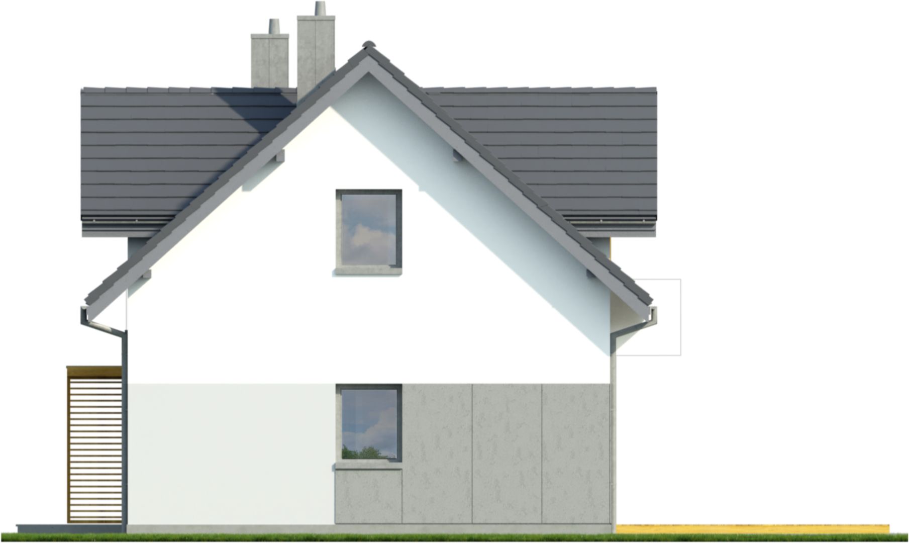 Graficzne opracowanie rzutów poglądowych widocznych na karcie projektu zostało wykonane przez Extradom.pl. Prezentowane przez Extradom.pl wizualizacje wykonane zostały przez autora projektu i należy poczytywać je jedynie za przykład i propozycję wykończenia, wizję architektoniczną autora projektu. Ostateczne wykończenie budynku może nastąpić na wiele sposobów. Szczegółowe rozwiązania zastosowane w oferowanej dokumentacji - w tym również ilość, lokalizacje i wygląd okien, drzwi, kominów - mogą w niewielkim stopniu różnić się od prezentowanej wizualizacji budynku.