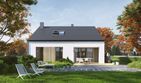 Graficzne opracowanie rzutów poglądowych widocznych na karcie projektu zostało wykonane przez Extradom.pl. Prezentowane przez Extradom.pl wizualizacje wykonane zostały przez autora projektu i należy poczytywać je jedynie za przykład i propozycję wykończenia, wizję architektoniczną autora projektu. Ostateczne wykończenie budynku może nastąpić na wiele sposobów. Szczegółowe rozwiązania zastosowane w oferowanej dokumentacji - w tym również ilość, lokalizacje i wygląd okien, drzwi, kominów - mogą w niewielkim stopniu różnić się od prezentowanej wizualizacji budynku.