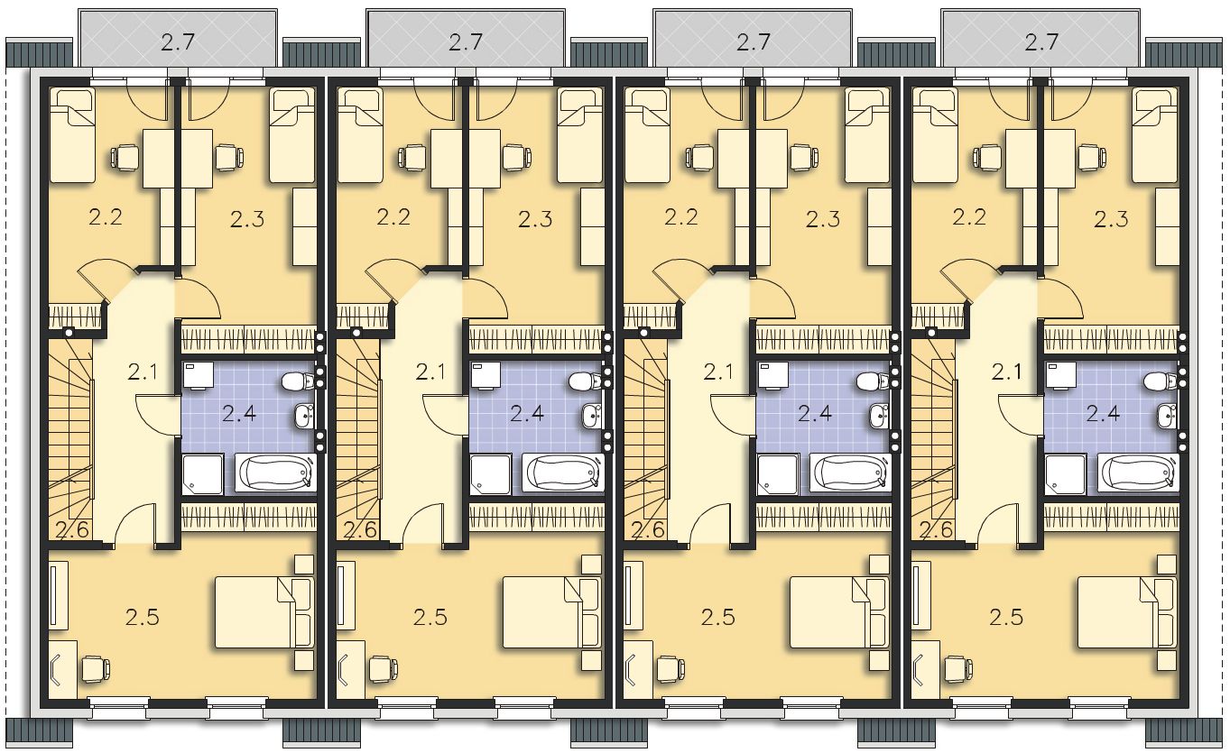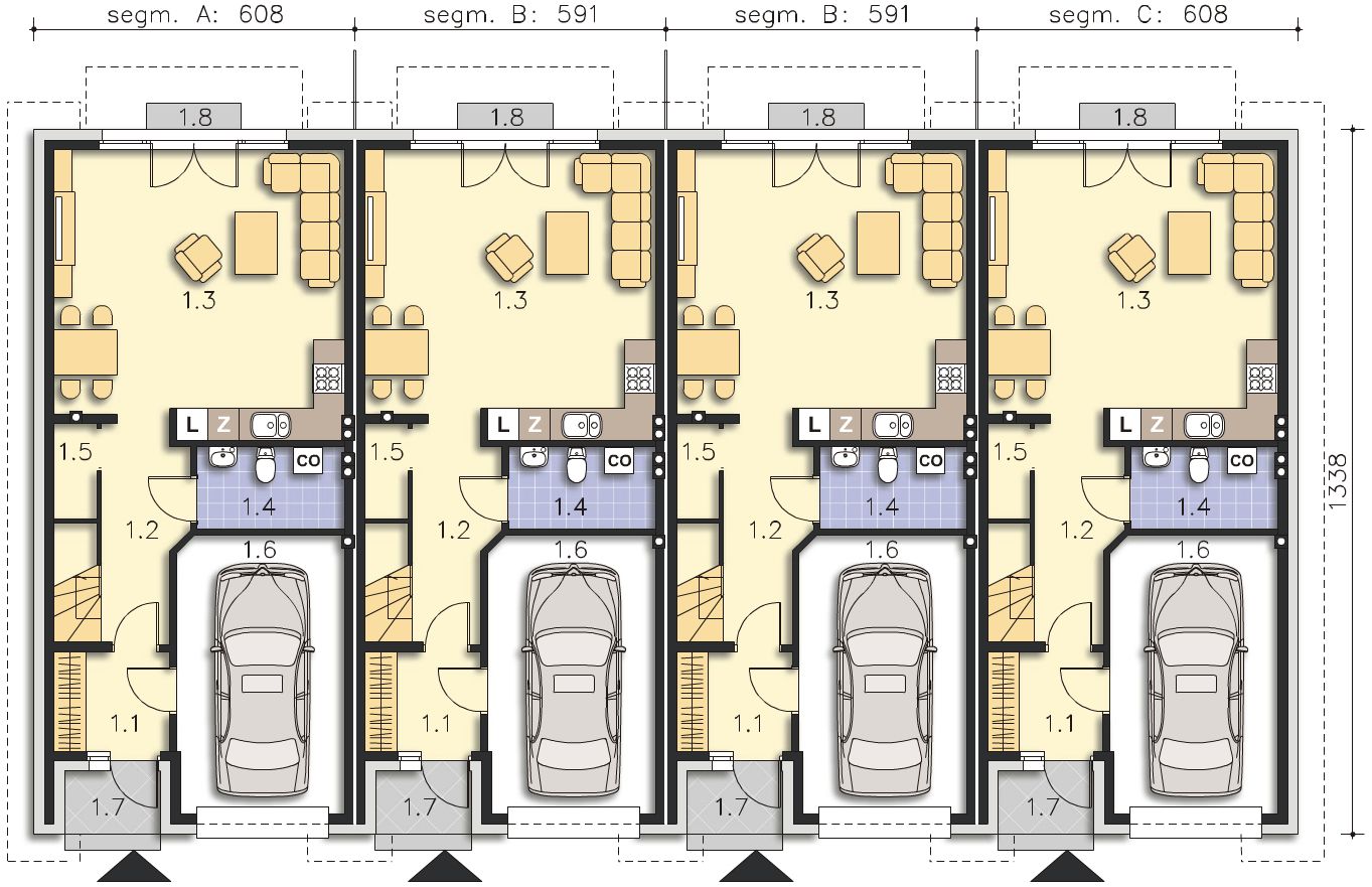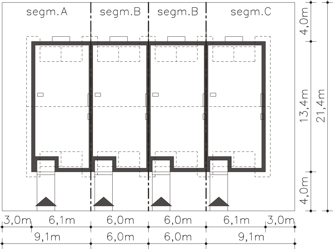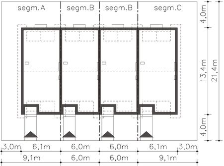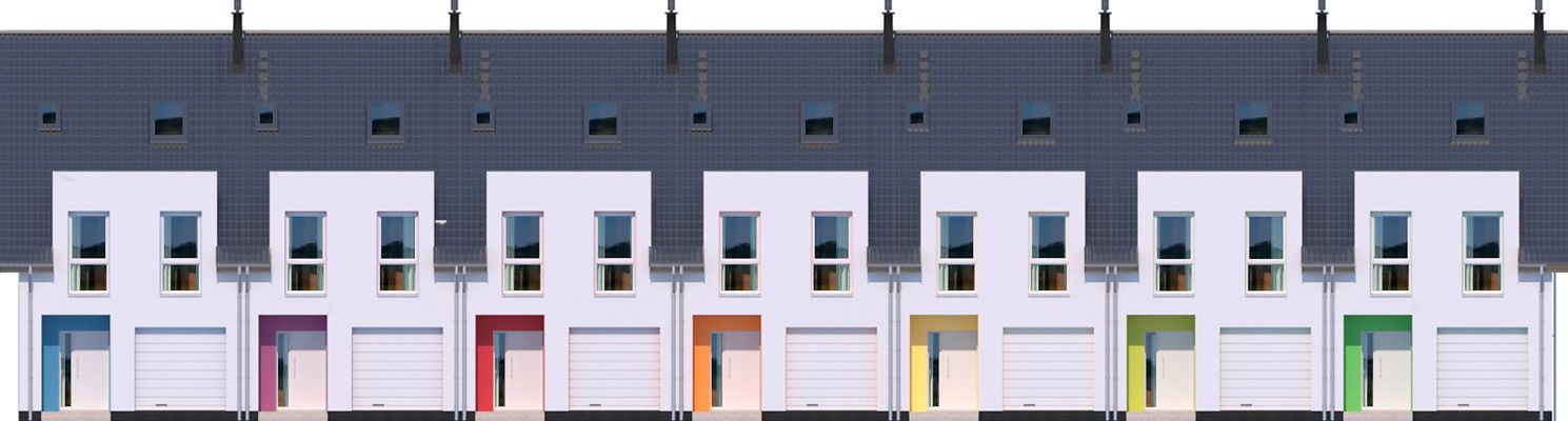 Ze względu na dostosowanie projektu do aktualnych norm wymiary budynku mogą ulec zmianie. Projekt dostępny w konfiguracjach: szeregówka na osobnej dokumentacji albo na jednej dokumentacji oraz bliźniak na jednej dokumentacji