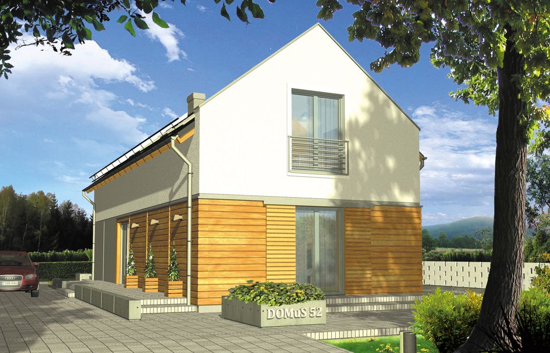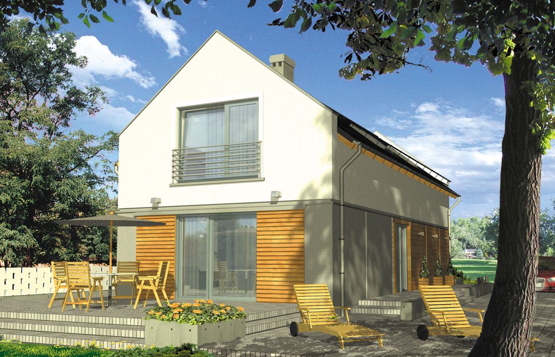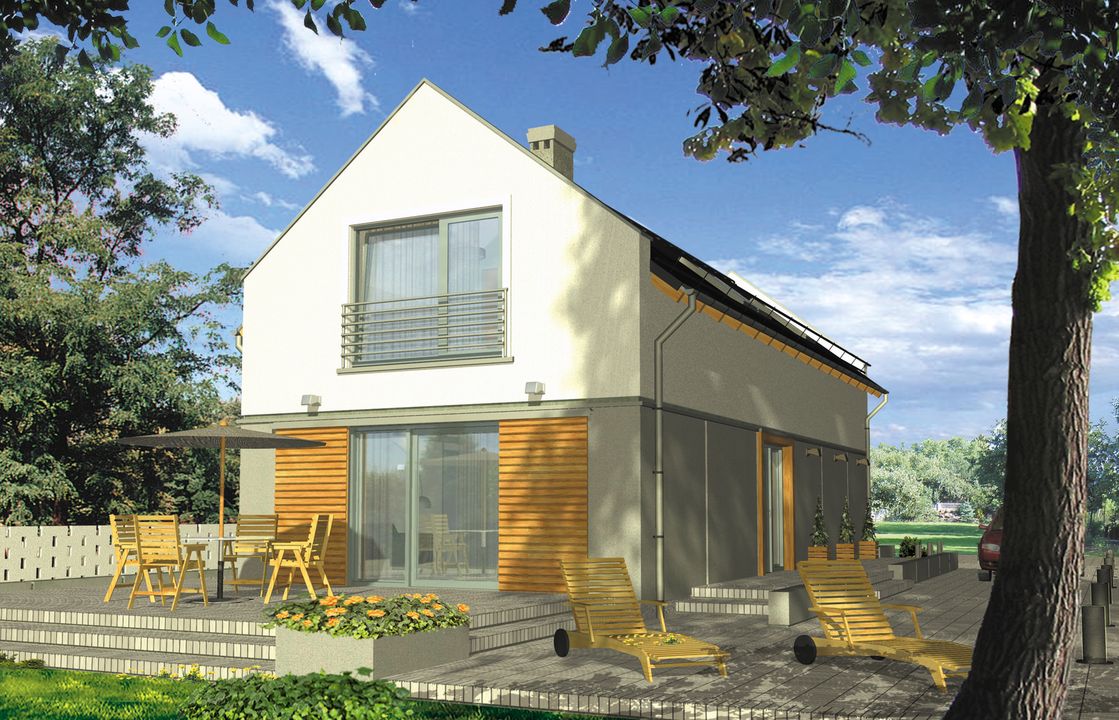 Ściany zewnętrzne: beton komórkowy gr. 24 cm + styropian Termo Organika Termonium Plus gr. 16 cm. Ściany wewnętrzne: bloczek silikatowy. Ściany fundamentowe: bloczek betonowy. Strop: Teriva. Konstrukcja dachu: drewniana. W projekcie przewidziano instalacje: c.o. i c.w.u. zasilana kotłem, grzejniki płytowe, instalacje wodno-kanalizacyjna oraz elektryczne, wentylacja grawitacyjna. Pokrycie dachowe: dachówka cementowa (w ramach adaptacji inny materiał). Ścianki działowe na parterze: bloczek silikatowy. Schody: drewniane zabiegowe. Okna: PVC. Okna dachowe i wyłaz dachowy: Fakro. Projekt w fazie koncepcji. Okres oczekiwania: 4 tygodnie od daty zamówienia.
