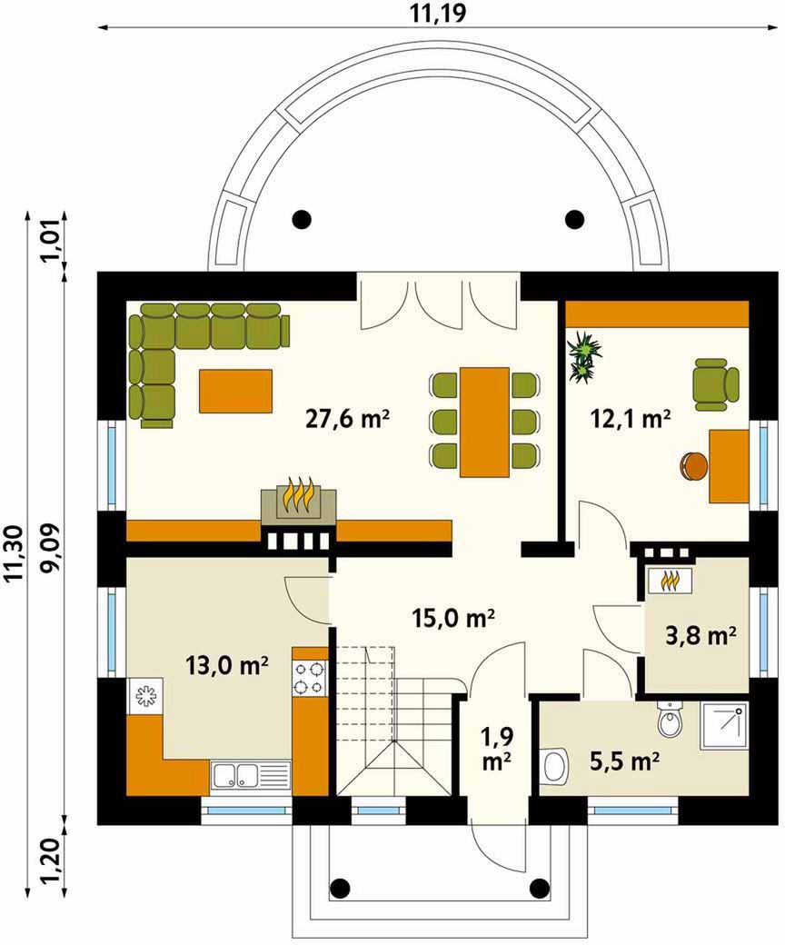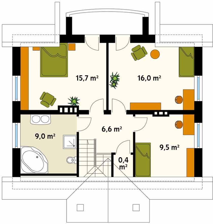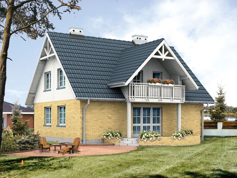 Graficzne opracowanie rzutów poglądowych widocznych na karcie projektu zostało wykonane przez Extradom.pl. Prezentowane przez Extradom.pl wizualizacje wykonane zostały przez autora projektu i należy poczytywać je jedynie za przykład i propozycję wykończenia, wizję architektoniczną autora projektu. Ostateczne wykończenie budynku może nastąpić na wiele sposobów. Szczegółowe rozwiązania zastosowane w oferowanej dokumentacji - w tym również ilość, lokalizacje i wygląd okien, drzwi, kominów - mogą w niewielkim stopniu różnić się od prezentowanej wizualizacji budynku.