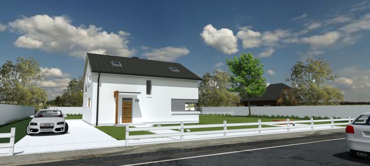 Graficzne opracowanie rzutów poglądowych widocznych na karcie projektu zostało wykonane przez Extradom.pl. Prezentowane przez Extradom.pl wizualizacje wykonane zostały przez autora projektu i należy poczytywać je jedynie za przykład i propozycję wykończenia, wizję architektoniczną autora projektu. Ostateczne wykończenie budynku może nastąpić na wiele sposobów. Szczegółowe rozwiązania zastosowane w oferowanej dokumentacji - w tym również ilość, lokalizacje i wygląd okien, drzwi, kominów - mogą w niewielkim stopniu różnić się od prezentowanej wizualizacji budynku.