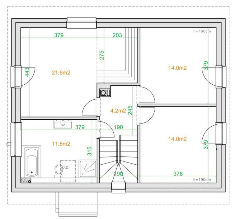 Ogrzewanie: kocioł gazowy / elektryczne. Fundament: płyta fundamentowa 25cm + 15xps + 10cm eps lub ławy fundamentowe. Ściany: beton komórkowy Termalica 24cm + eps 20cm. Dach: drewniany + 40cm izolacji. c.w.u.: kocioł gazowy / elektryczne. Wentylacja: mechaniczna z reku.
