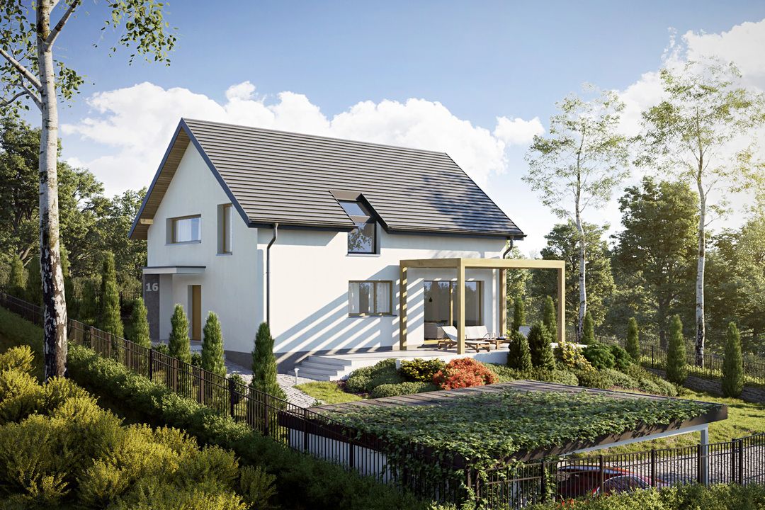 Graficzne opracowanie rzutów poglądowych widocznych na karcie projektu zostało wykonane przez Extradom.pl. Prezentowane przez Extradom.pl wizualizacje wykonane zostały przez autora projektu i należy poczytywać je jedynie za przykład i propozycję wykończenia, wizję architektoniczną autora projektu. Ostateczne wykończenie budynku może nastąpić na wiele sposobów. Szczegółowe rozwiązania zastosowane w oferowanej dokumentacji - w tym również ilość, lokalizacje i wygląd okien, drzwi, kominów - mogą w niewielkim stopniu różnić się od prezentowanej wizualizacji budynku.