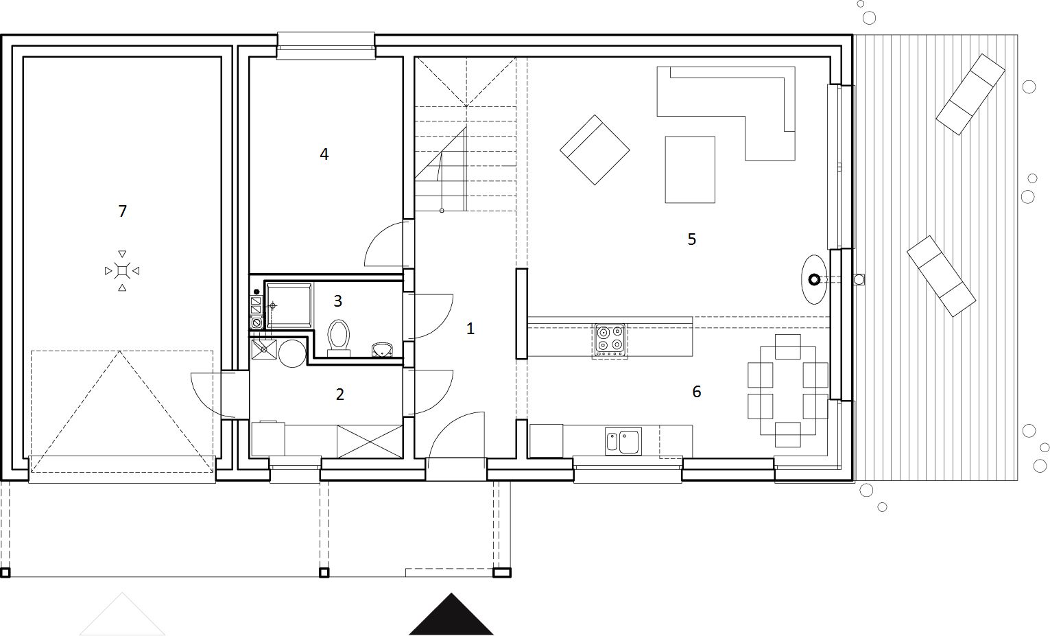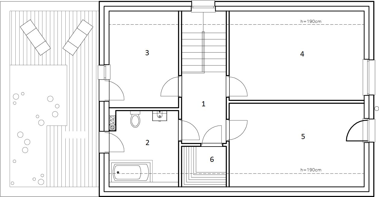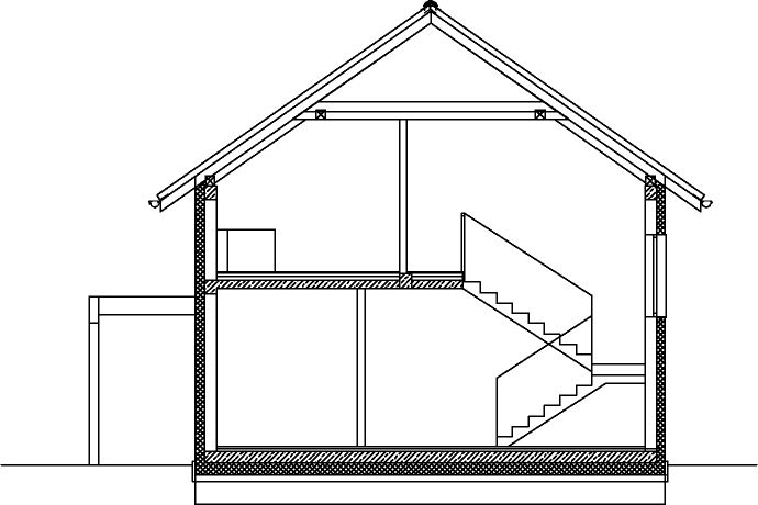 Fundamenty: ława fundamentowa lub płyta fundamentowa 35 cm beton + 20 cm EPS200. Ściany: dwuwarstwowe, pustak ceramiczny porotherm 18,8 cm PW + 20 cm EPS70. Stropy: monolityczne żelbetowe, gr. 15 cm. Dach: drewniany, pokrycie: blacha płaska lub dachówka. Ogrzewanie: kocioł gazowy lub pompa ciepła wg. projektu Sofath. Wentylacja: grawitacyjna lub mechaniczna z rekuperacją wg. projektu Sofath