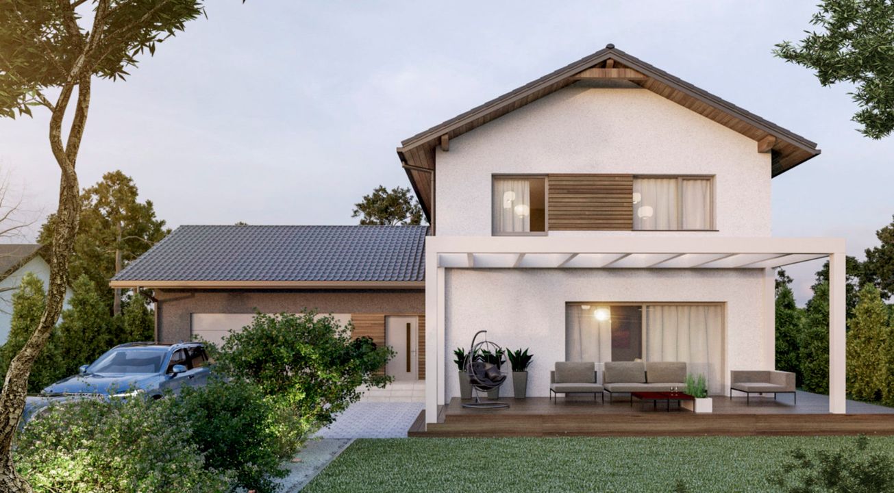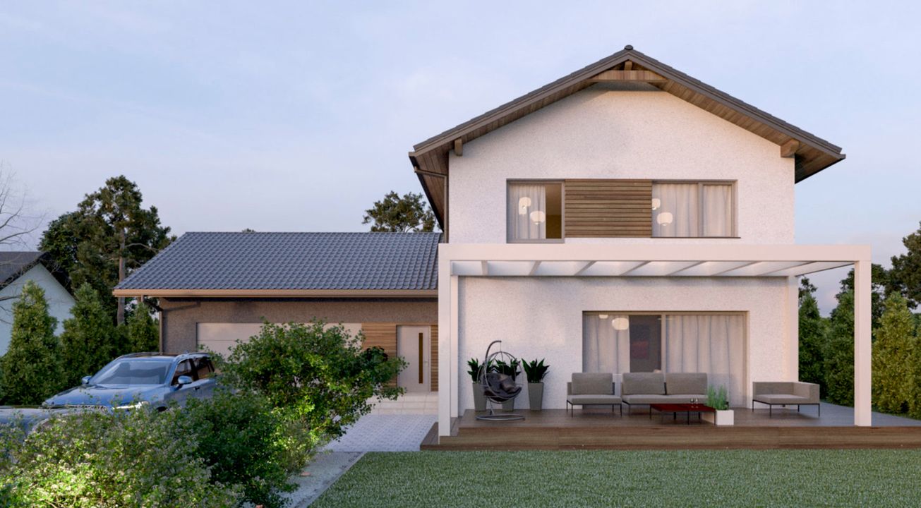 Graficzne opracowanie rzutów poglądowych widocznych na karcie projektu zostało wykonane przez Extradom.pl. Prezentowane przez Extradom.pl wizualizacje wykonane zostały przez autora projektu i należy poczytywać je jedynie za przykład i propozycję wykończenia, wizję architektoniczną autora projektu. Ostateczne wykończenie budynku może nastąpić na wiele sposobów. Szczegółowe rozwiązania zastosowane w oferowanej dokumentacji - w tym również ilość, lokalizacje i wygląd okien, drzwi, kominów - mogą w niewielkim stopniu różnić się od prezentowanej wizualizacji budynku.