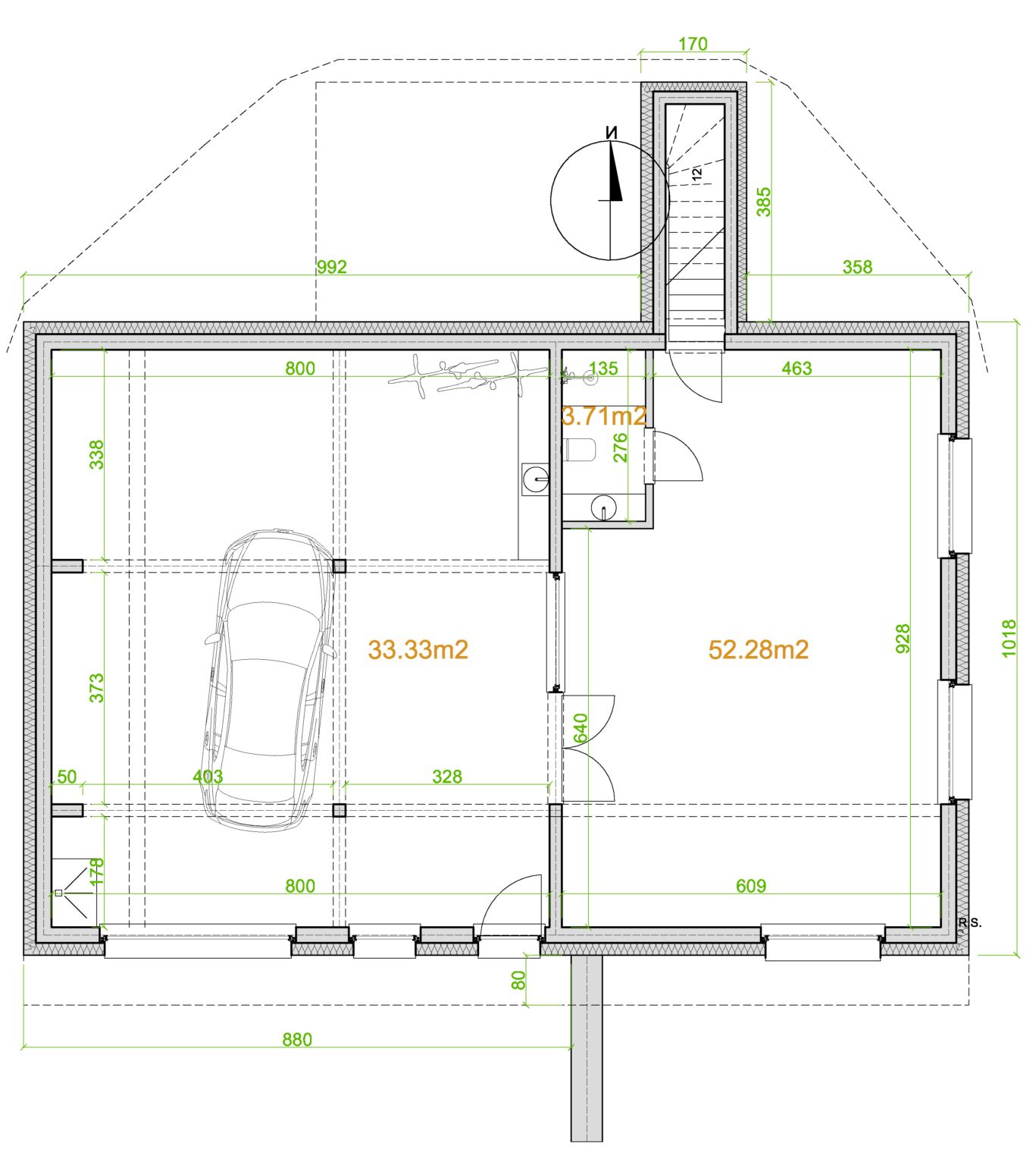 Strop nad piwnicą strop żelbetowy, nad parterem strop drewniany( nad salonem sufit katedralny) Fundament: ławy fundamentowe lub płyta fundamentowa 25cm + 20xps + 10cm eps. Ściany: beton komórkowy Termalica 24cm + eps 20cm. Dach: więźba drewniana + 40cm izolacji. c.w.u.: gazowe lub elektryczne + fotowoltaika. Wentylacja: mechaniczna z reku.