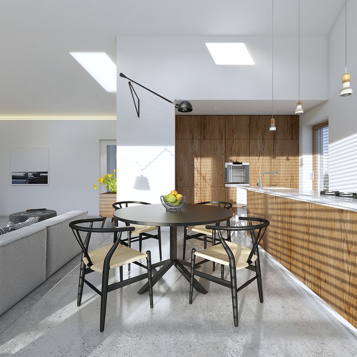 Graficzne opracowanie rzutów poglądowych widocznych na karcie projektu zostało wykonane przez Extradom.pl. Prezentowane przez Extradom.pl wizualizacje wykonane zostały przez autora projektu i należy poczytywać je jedynie za przykład i propozycję wykończenia, wizję architektoniczną autora projektu. Ostateczne wykończenie budynku może nastąpić na wiele sposobów. Szczegółowe rozwiązania zastosowane w oferowanej dokumentacji - w tym również ilość, lokalizacje i wygląd okien, drzwi, kominów - mogą w niewielkim stopniu różnić się od prezentowanej wizualizacji budynku.