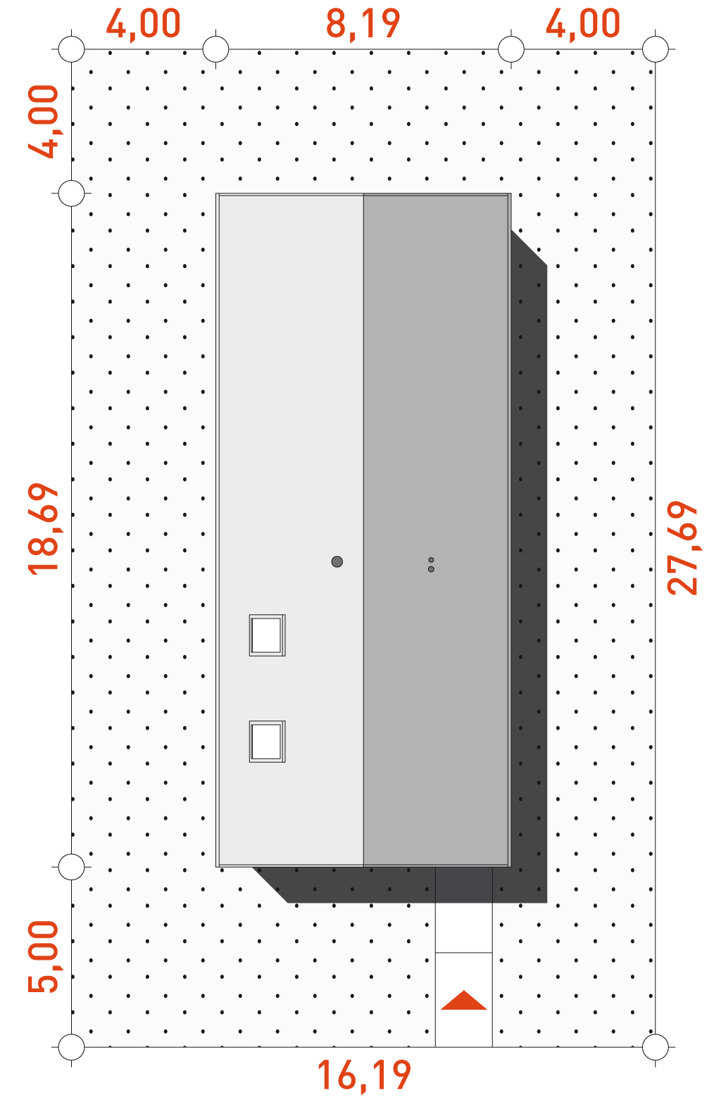 Konstrukcja: zgodna z normami EUROKOD. Fundamenty: tradycyjne ławy i stopy żelbetowe. Ściany: bloczek silikatowy + styropian na etapie adaptacji projektu istnieje możliwość zamiany bloczka silikatowego na inny materiał o podobnych parametrach wytrzymałosciowych, np. na pustak ceramiczny. Elewacja: tynk Stropy: drewniane na etapie adaptacji projektu istnieje możliwość zmiany technologii stropu na żelbetowe, gęstożebrowe lub prefabrykowane. Dach: płyta falista z włóknocementu konstrukcja więźby przewidziana pod pokrycie ciężkie dla I strefy wiatrowej i II strefy śniegowej.