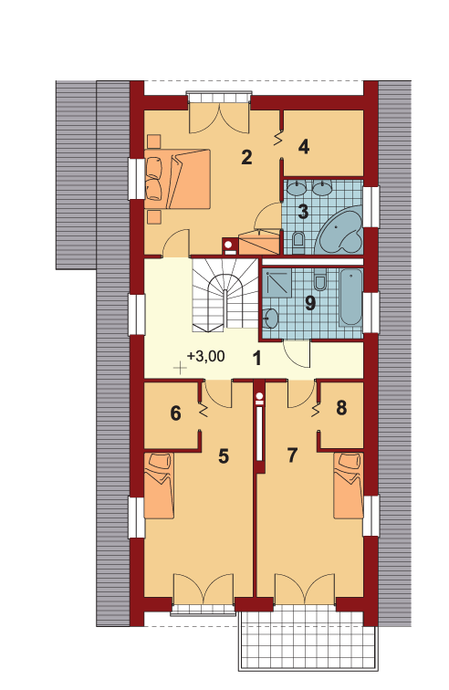 Dach dwuspadowy pokryty dachówką. Stropy żelbetowe gęstożebrowe, prefabrykowane. Ściany trzywarstwowe: pustak ceramiczny + izolacja termiczna + cegła elewacyjna.