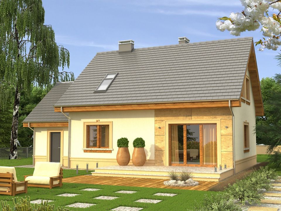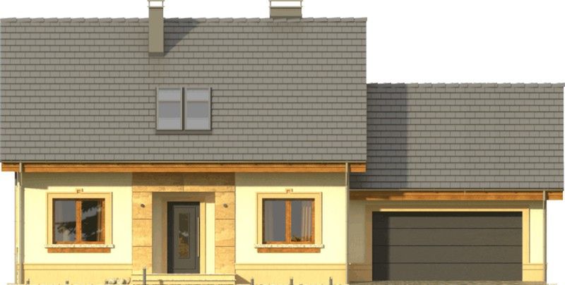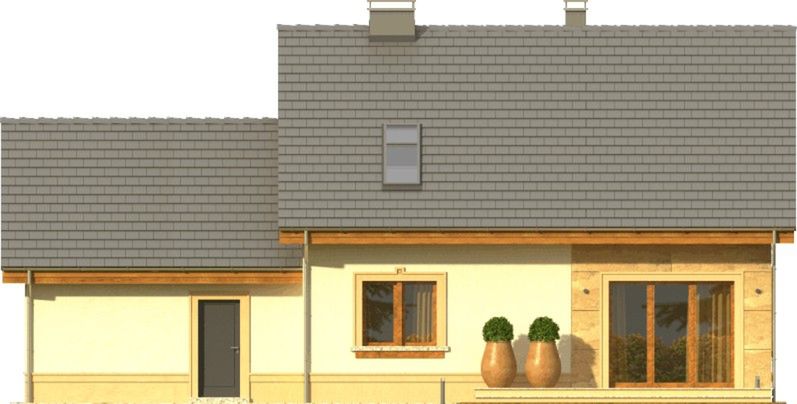 Graficzne opracowanie rzutów poglądowych widocznych na karcie projektu zostało wykonane przez Extradom.pl. Prezentowane przez Extradom.pl wizualizacje wykonane zostały przez autora projektu i należy poczytywać je jedynie za przykład i propozycję wykończenia, wizję architektoniczną autora projektu. Ostateczne wykończenie budynku może nastąpić na wiele sposobów. Szczegółowe rozwiązania zastosowane w oferowanej dokumentacji - w tym również ilość, lokalizacje i wygląd okien, drzwi, kominów - mogą w niewielkim stopniu różnić się od prezentowanej wizualizacji budynku.